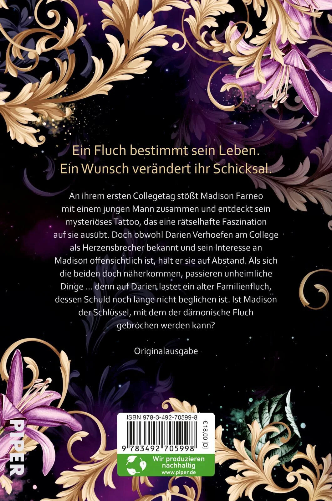 An ihrem ersten Collegetag sto?t Madison Farneo mit einem jungen Mann zusammen und entdeckt sein mysterioses Tattoo, um das sich die Geruchte ranken. Und Darien Verhoefen gibt noch ganz andere Ratsel auf: Obwohl er am College als Herzensbrecher bekannt und sein Interesse an Madison offensichtlich ist, halt er sie auf Abstand. Als sich die beiden doch naherkommen, passieren unheimliche Dinge ... denn auf Darien lastet ein alter Familienfluch, dessen Schuld noch lange nicht beglichen ist. Ist Madisons Liebe der Schlussel, mit dem der damonische Fluch gebrochen werden kann?