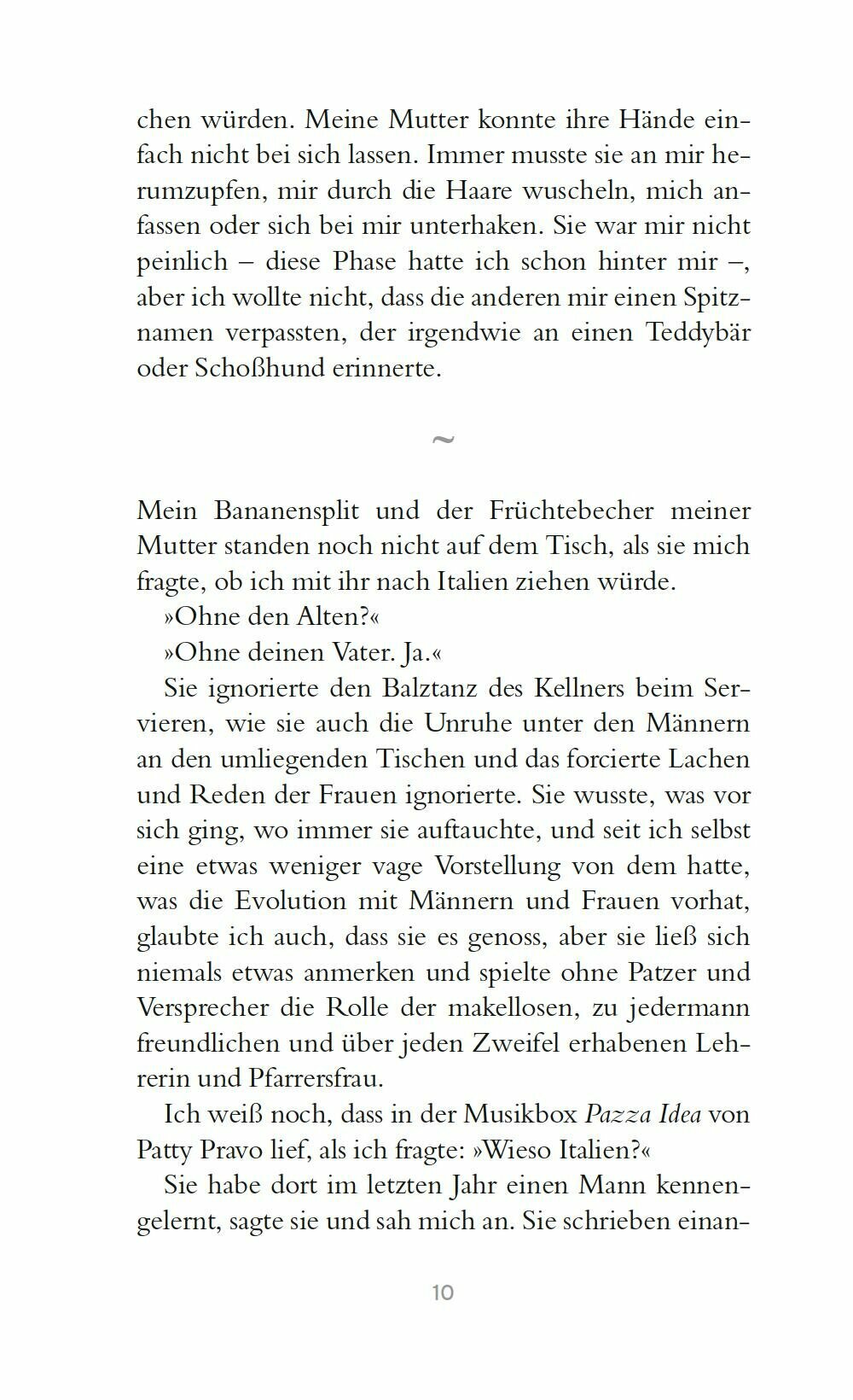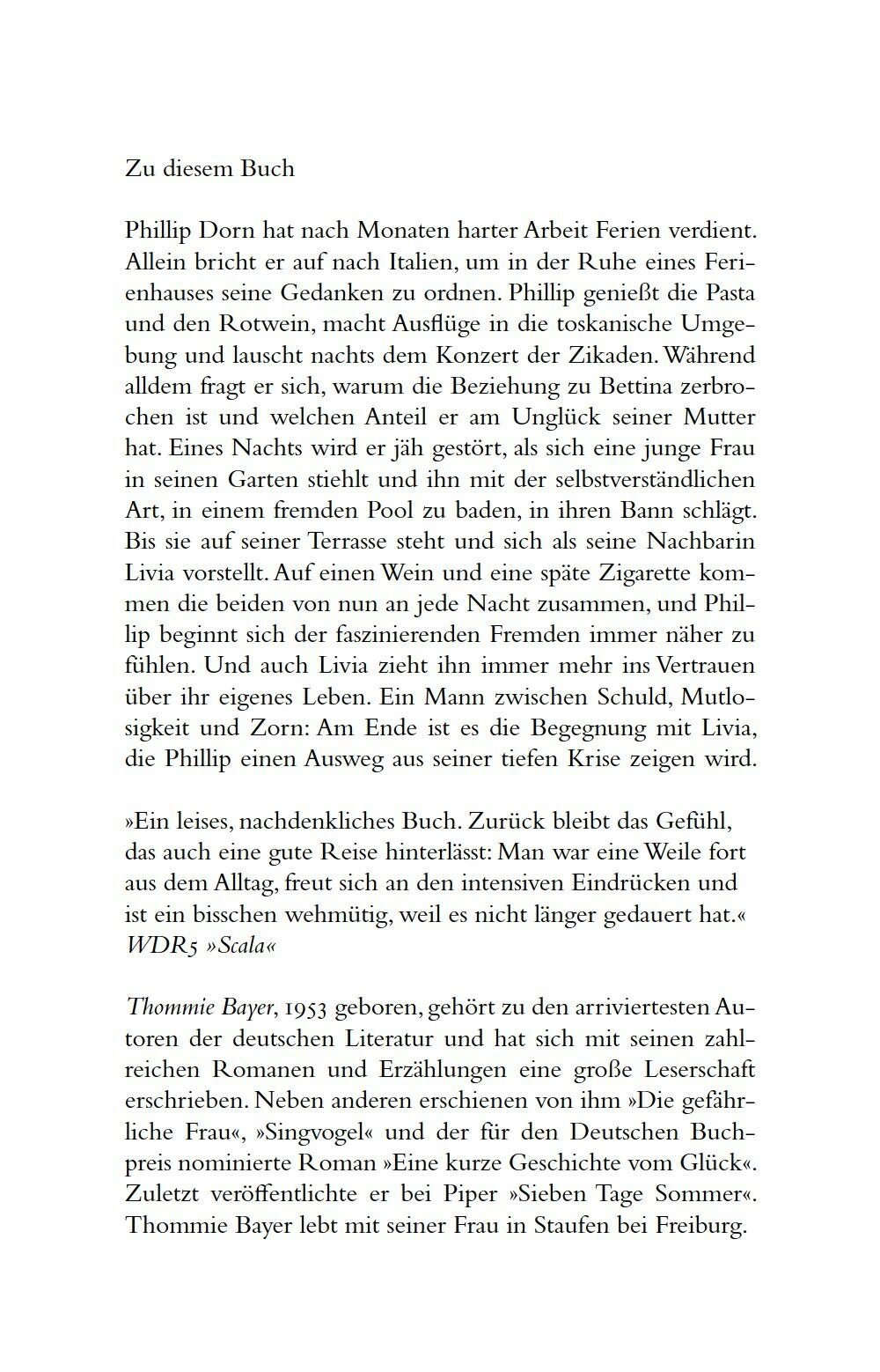 Es dauert allerdings nicht lang, da taucht eine schone Fremde in seinem Ferienhaus auf und benutzt heimlich seinen Pool. Sie wirft nicht nur Fragen zu seiner gescheiterten Beziehung mit Bettina auf, sondern auch zum zerrissenen Verhaltnis mit seiner verstorbenen Mutter. Die wollte fruher mit ihrem Sohn nach Italien ziehen, doch Philipp hatte damals keine Lust: Er war zum ersten Mal verliebt und hatte gerade eine Band gegrundet. Was ware gewesen, wenn? Und was verbindet die schone Frau im Pool mit seiner Mutter?