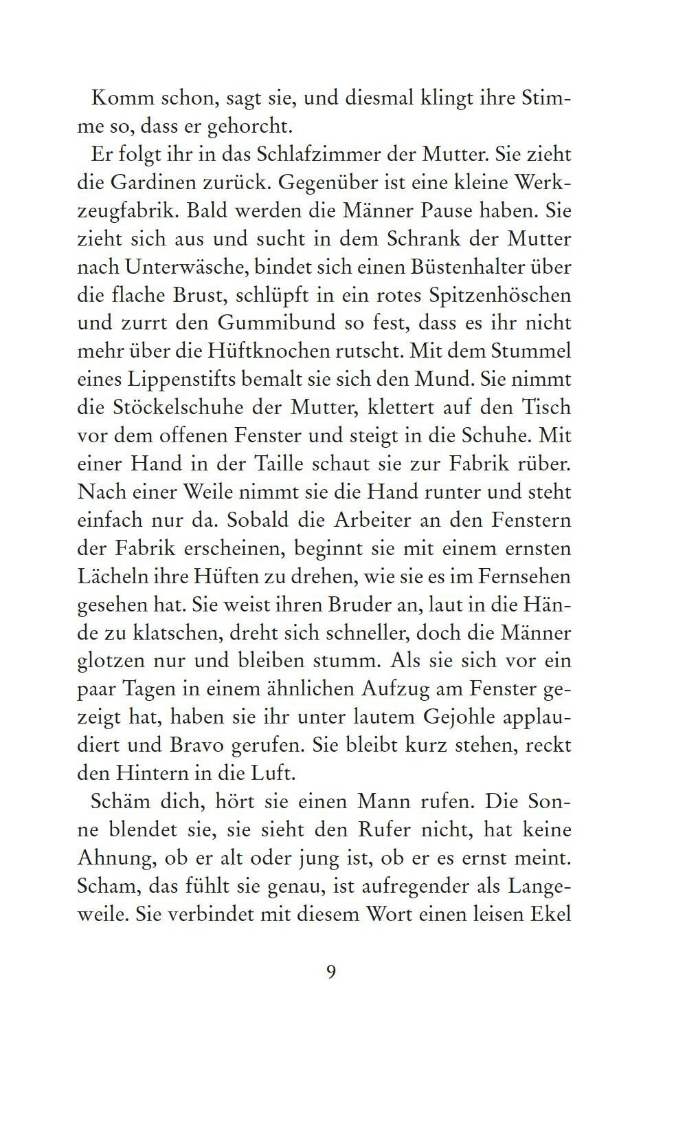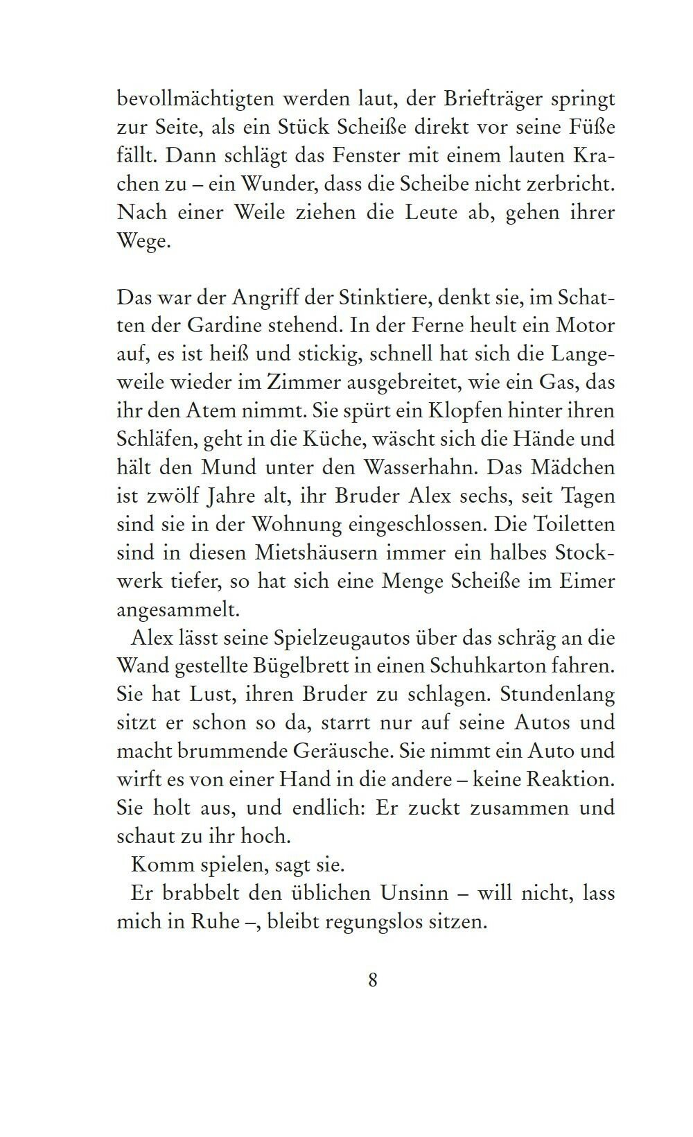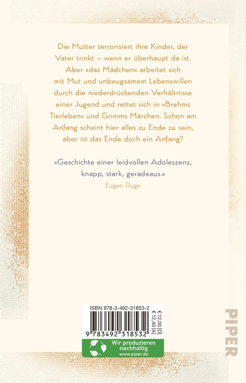 Die Mutter terrorisiert ihre Kinder, der Vater trinkt – wenn er uberhaupt da ist. Aber ›das Madchen‹ arbeitet sich mit Mut und unbeugsamem Lebenswillen durch die niederdruckenden Verhaltnisse einer Jugend und rettet sich in „Brehms Tierleben“ und Grimms Marchen. Schon am Anfang scheint hier alles zu Ende zu sein, aber ist das Ende doch ein Anfang?