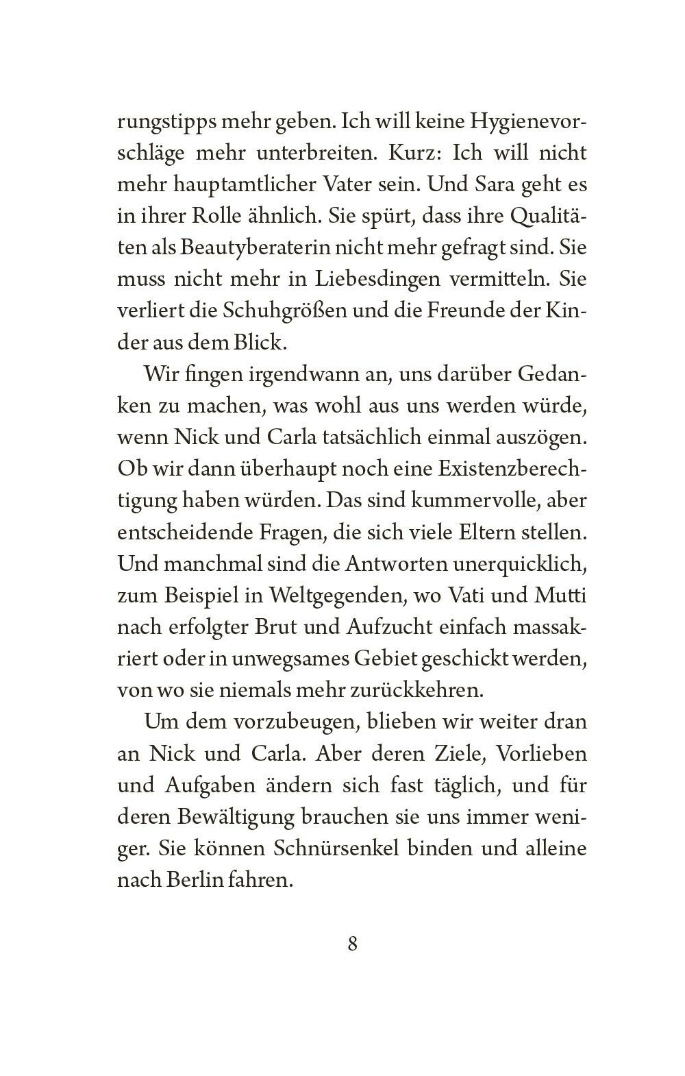 Irgendwann ist es soweit: Wenn aus Pubertieren Erwachsene werden, ist es an Papa und Mama, sich zu verwandeln. Eben noch Gegner mutieren sie zu den milde belachelten, ahnungslosen: Altern. Und naturlich sind sie darauf ganz schlecht vorbereitet, denn ist ja so: Man ist 49, fuhlt sich wie 29 – wird aber behandelt, als sei man 79. Und sieht einer ungewissen Zukunft ohne Wascheberge, Jungs-Deo und leeren Chipstuten entgegen. Beunruhigt fragt man sich vielleicht: Werden die in die Freiheit entlassenen Pubertiere noch einmal den Weg zuruck in den heimischen Stall finden? Und was wird eigentlich, wenn samtliche Lastschriftauftrage fur die Kinder einmal erloschen sein werden? Ist man dann fur immer allein?