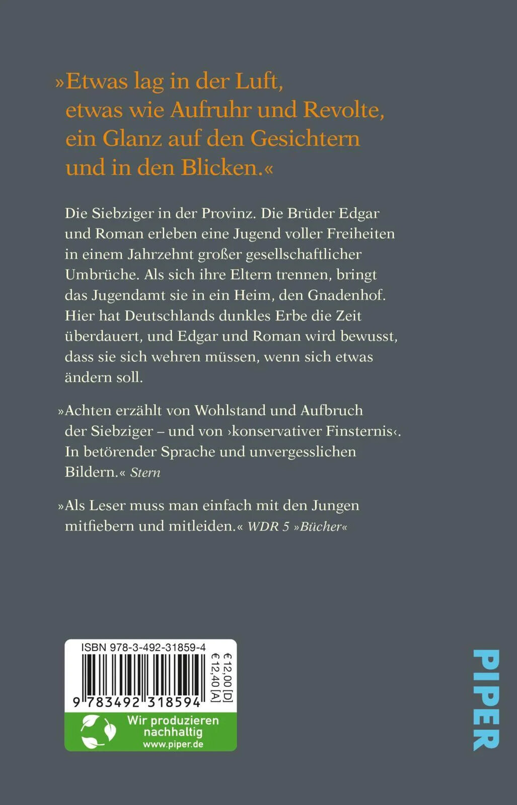 Die Siebziger in der westdeutschen Provinz. Ein Dorf, in dem die Zeit stillzustehen scheint. Fur Edgar und seinen Bruder Roman ist das Leben uberschaubar und gut. Bis sich ihr Vater am Maifest in die Tierarztin verliebt und die Familie verlasst. Die Mutter zieht sich immer mehr in ihren Lotto-Laden zuruck. Die Jungen sind bald sich selbst uberlassen. Schlie?lich steht das Jugendamt vor der Tur, um Edgar und Roman in den Gnadenhof zu holen. Ein Heim, in dem die Methoden der Nazis fortbestehen.
