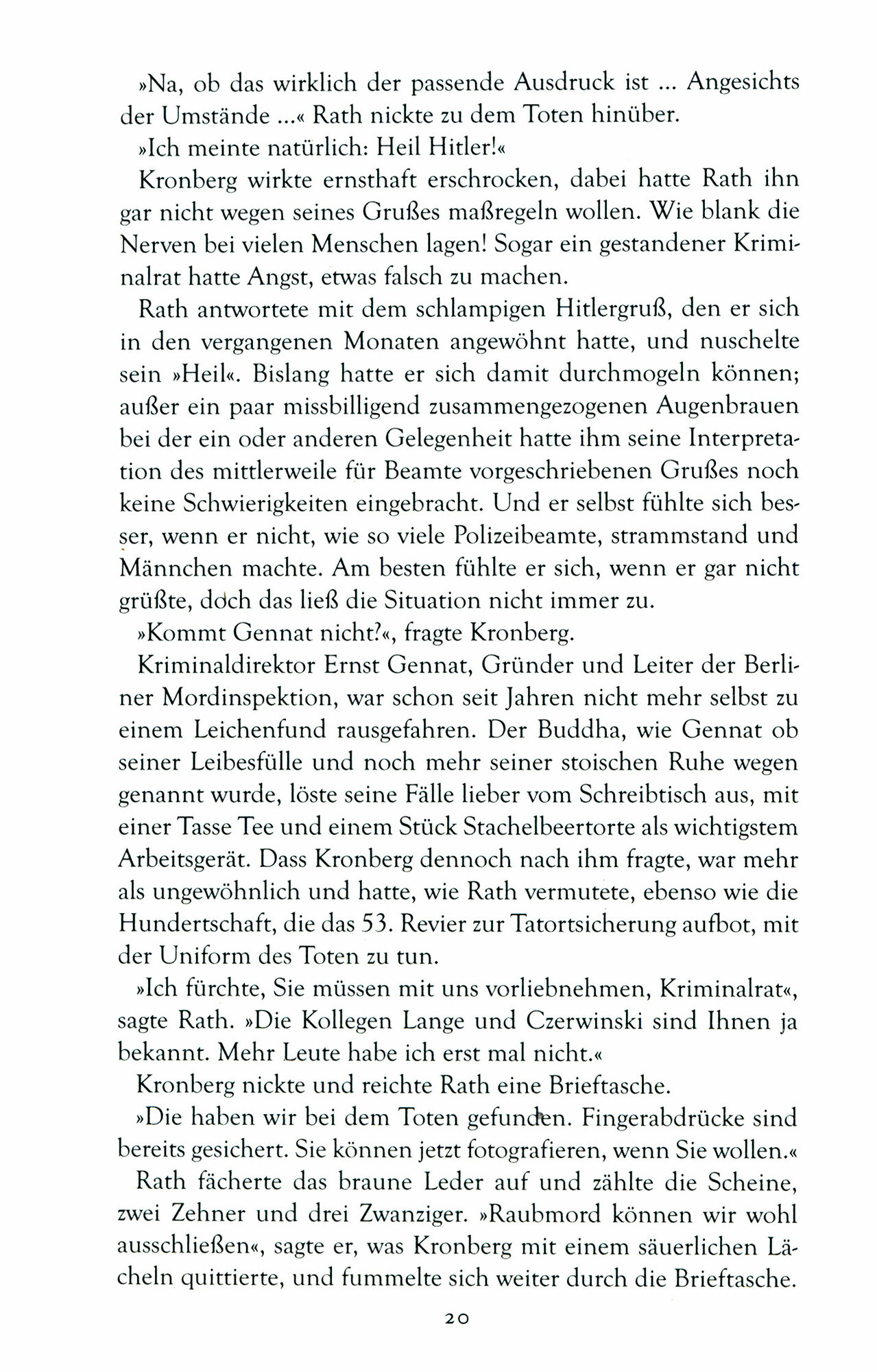 Berlin 1934: Unter der Eisenbahnbrucke an der Liesenstra?e wird ein toter SA-Mann gefunden, uber dem eine kommunistische Parole prangt. Am Tatort trifft Kommissar Gereon Rath auf seinen fruheren Kollegen Reinhold Graf, der inzwischen fur die Geheime Staatspolizei arbeitet. Wahrend Graf von einem politischen Mord ausgeht, ermittelt Rath in eine andere Richtung. Er entdeckt Verbindungen zu einem zerschlagenen Ringverein, der seine kriminellen Aktivitaten als SA getarnt fortsetzt. Als ein zweiter SA-Mann erschlagen aufgefunden wird, deutet alles auf eine Mordserie hin. Wahrend der Ermittlungen wird die politische Lage immer brisanter: Gereon Raths Frau gerat in SA-Haft und der Kommissar wird in einen Strudel sich uberschlagender Ereignisse gezogen, an deren Ende er selbst unter Druck gerat: Er soll einen Mord ausfuhren! Volker Kutscher liefert atemlose Spannung und das packende Portrat politisch hochst unruhiger Zeiten.