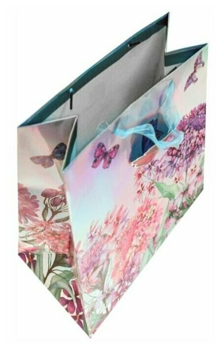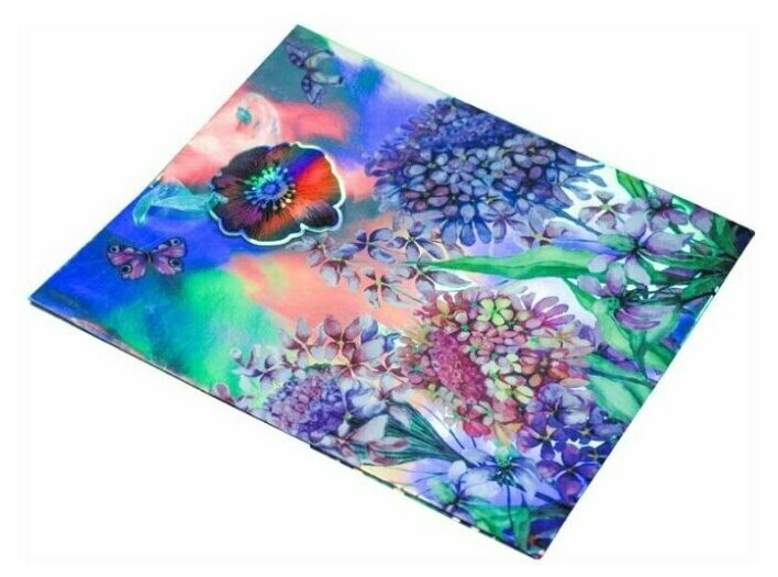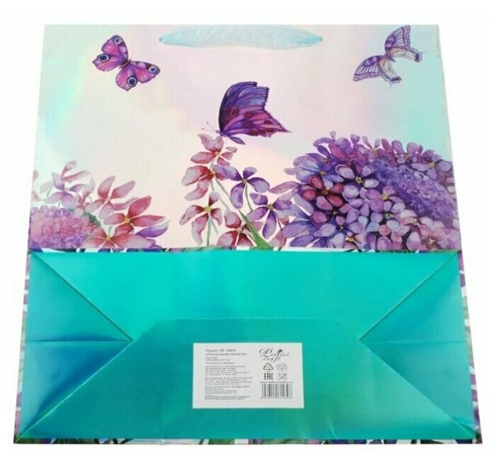 Отличительная дизайнерская особенность пакета – использование лучезарного, переливающегося на свету, голографического фона. Многообразие играющих между собой оттенков дополняется изображением различных соцветий и бабочек. Столь восхитительная тематика – приятное украшение для любого сюрприза!