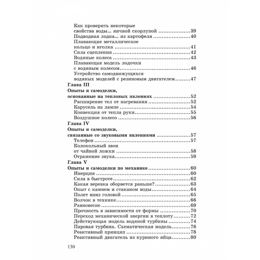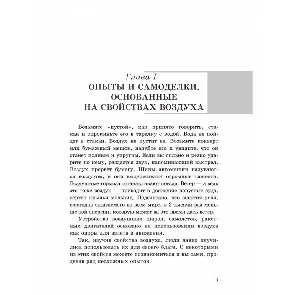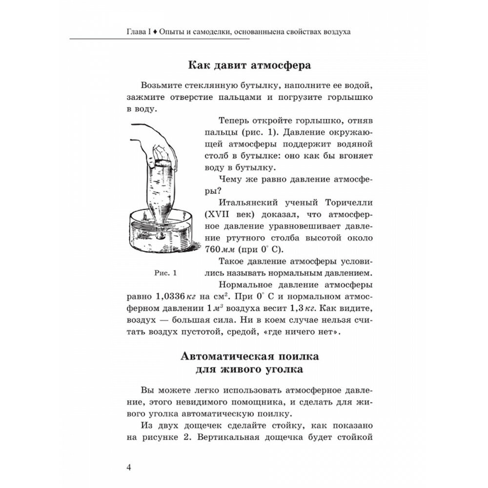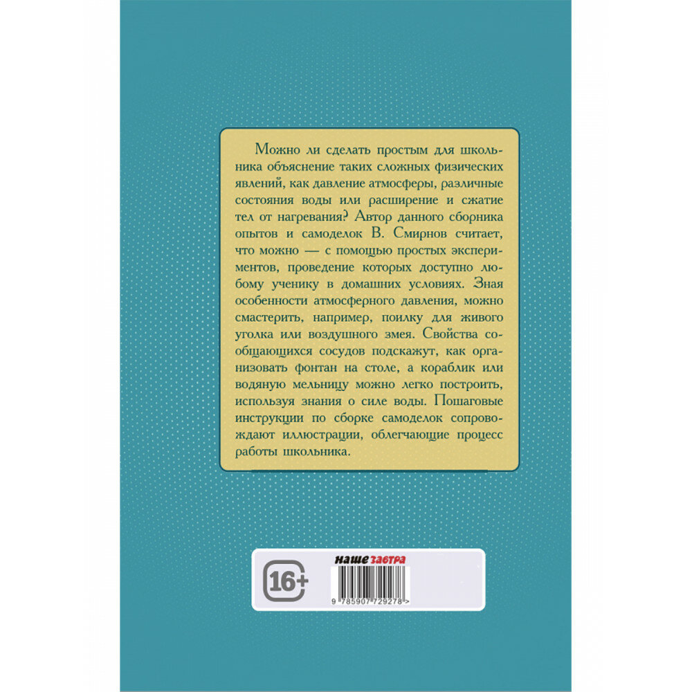 Можно ли сделать простым для школьника объяснение таких сложных физических явлений, как давление атмосферы, различные состояния воды или расширение и сжатие тел от нагревания? Автор данного сборника опытов и самоделок В. Смирнов считает, что можно - с помощью простых экспериментов, проведение которых доступно любому ученику в домашних условиях. Зная особенности атмосферного давления, можно смастерить, например, поилку для живого уголка или воздушного змея. Свойства сообщающихся сосудов подскажут, как организовать фонтан на столе, а кораблик или водяную мельницу можно легко построить, используя знания о силе воды.