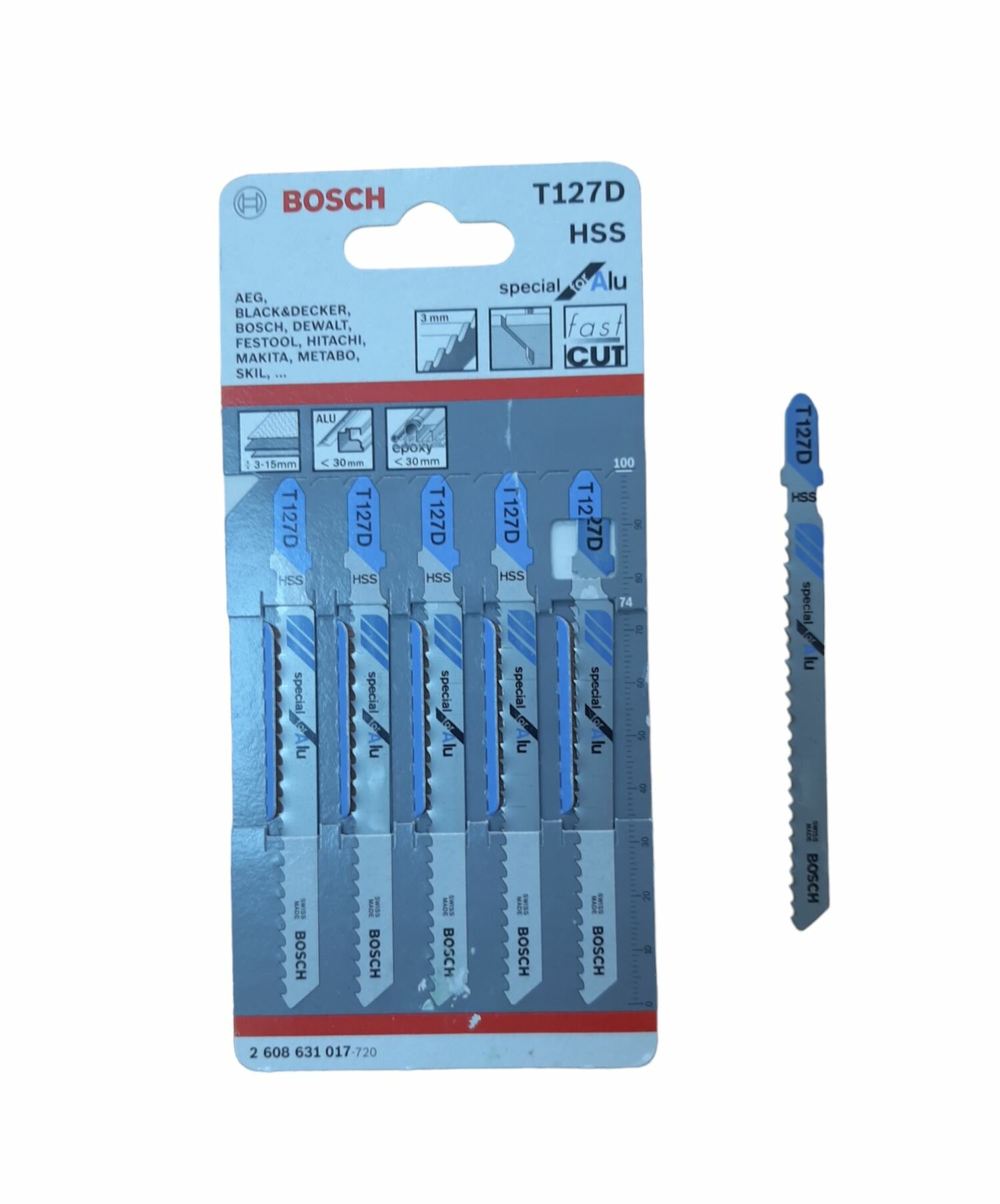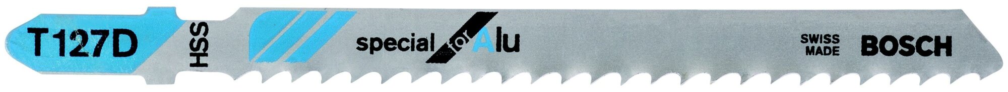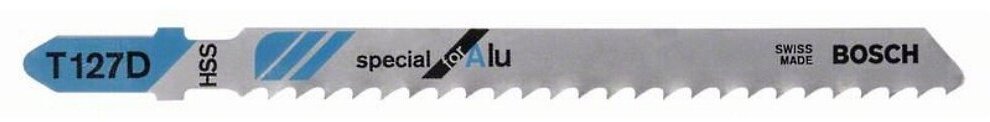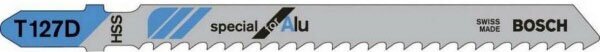 Лобзиковое пильное полотно T 127 D Special for Alu позволяет выполнять быстры прямые пропилы в металле. Геометрия разведенных зубьев с крупными овальными углублениями предназначена для быстрых пропилов. Полностью закаленное полотно из высококачественной быстрорежущей стали подходит для пиления алюминия и цветных металлов.