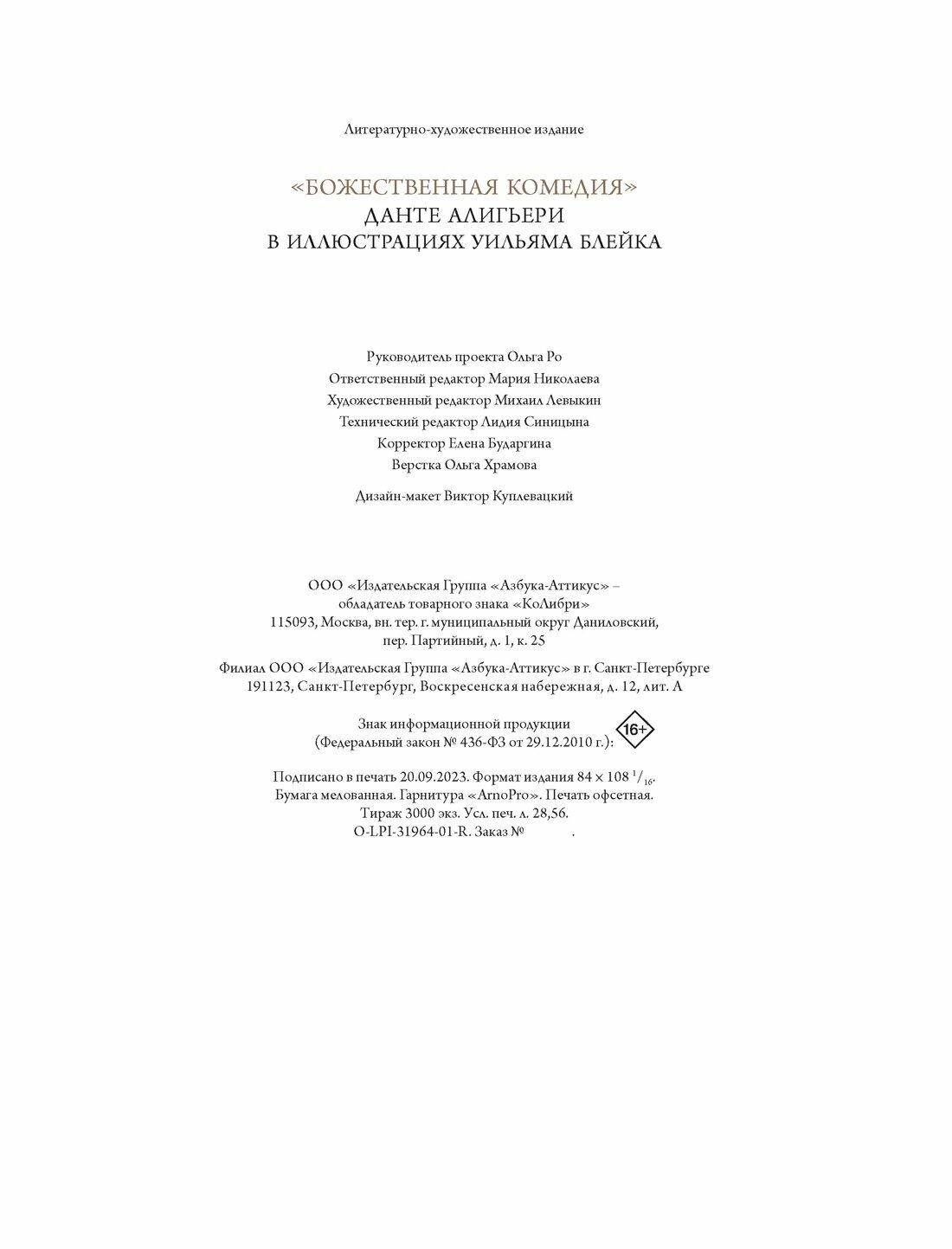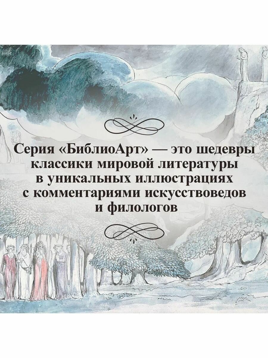 Вы держите в руках не просто безупречно изданную книгу. Итальянский поэтический шедевр в каноническом изящном и легком переводе блистательного Михаила Лозинского уже давно разобран в России на цитаты. А впервые публикующиеся в нашей стране иллюстрации к ней Уильяма Блейка, гениального и противоречивого английского мастера начала ХIХ века, дают новое видение духовных и нравственных сторон произведения.