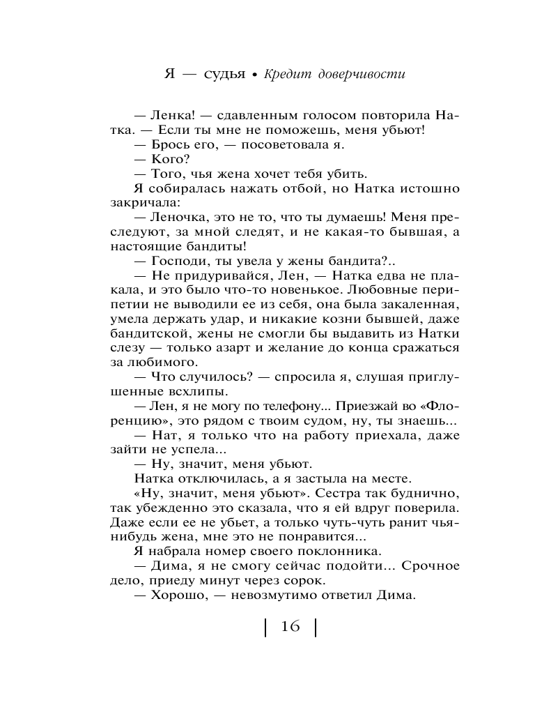 Тема, затронутая в романе самой знаковой писательницы современности Татьяны Устиновой и самого известного адвоката Павла Астахова, знакома многим не понаслышке. Наверное, потому, что история, рассказанная в нем, очень серьезная и болезненная для большинства из нас, так или иначе бравших кредиты! Кто-то выбрался из «кредитной ловушки» без потерь, кто-то, напротив, потерял многое — время, деньги, здоровье!.. Судье Лене Кузнецовой предстоит решить судьбу Виктора Малышева и его детей, которые вот-вот могут потерять квартиру, купленную когда-то по ипотеке. Одновременно ее сестра попадает в лапы кредитных мошенников. Лена — судья и должна быть беспристрастна, но ей так хочется помочь Малышеву, со всего маху угодившему разом во все жизненные трагедии и неприятности! Она найдет решение труднейшей головоломки, когда уже почти не останется надежды на примирение и благополучный исход дела…