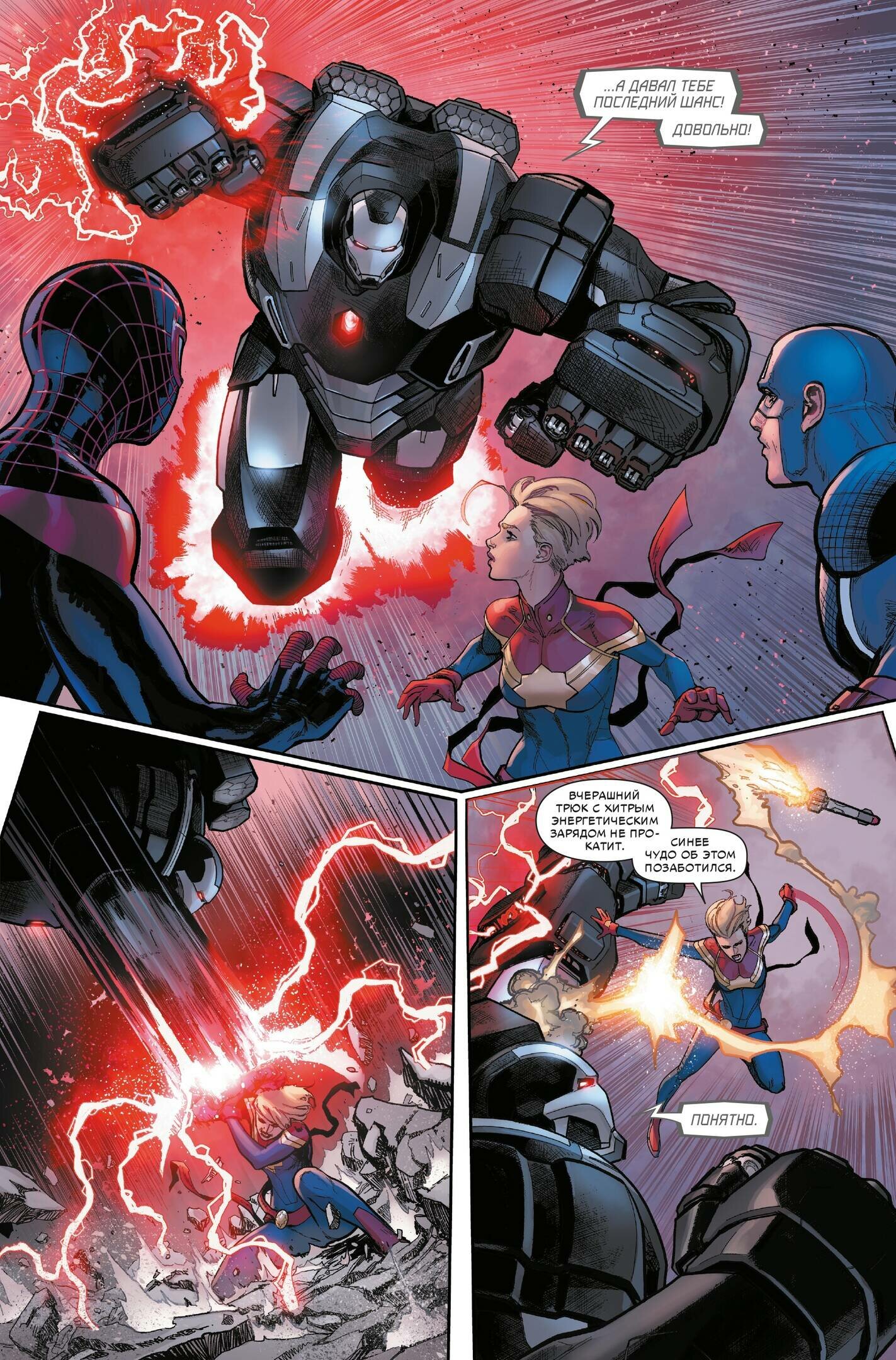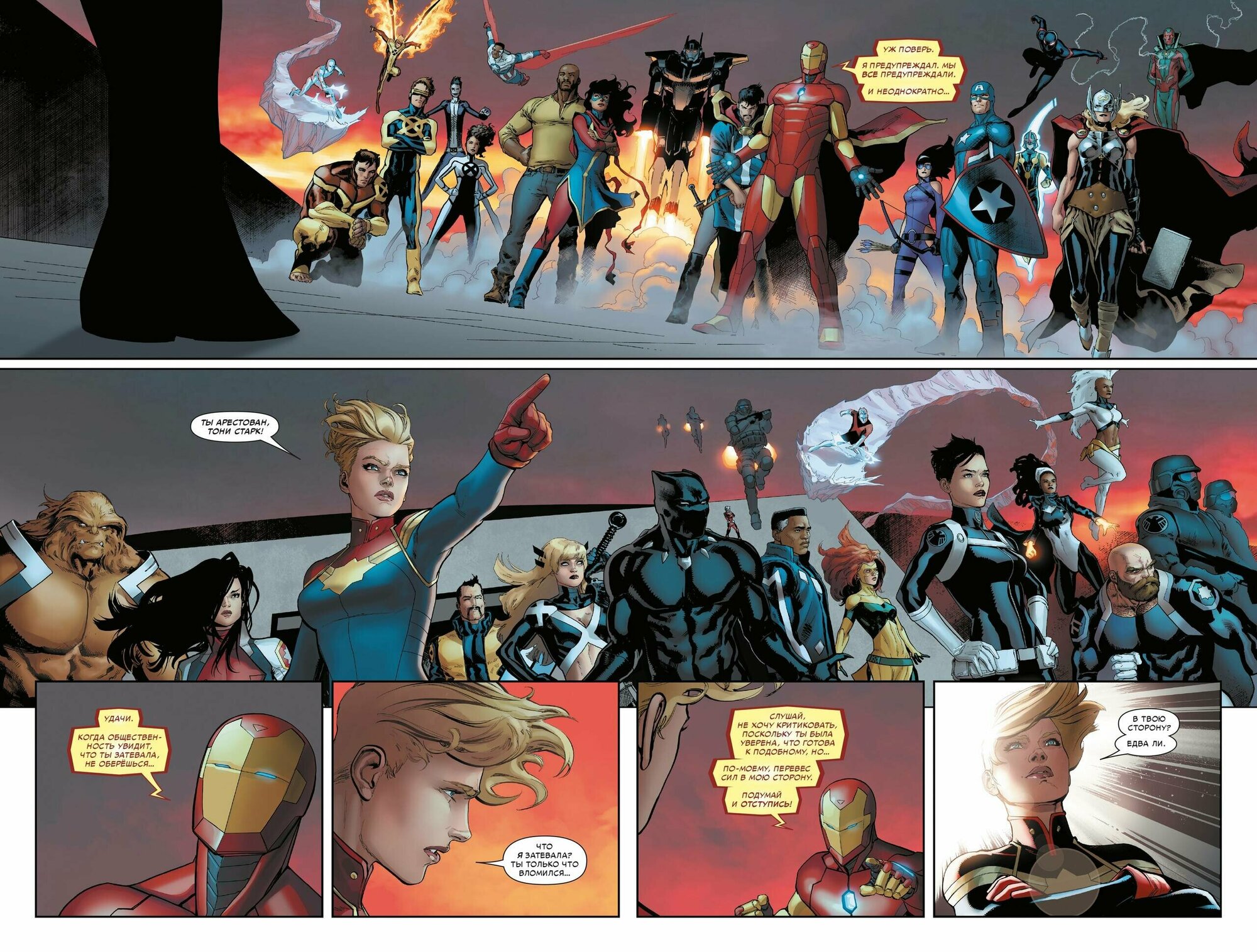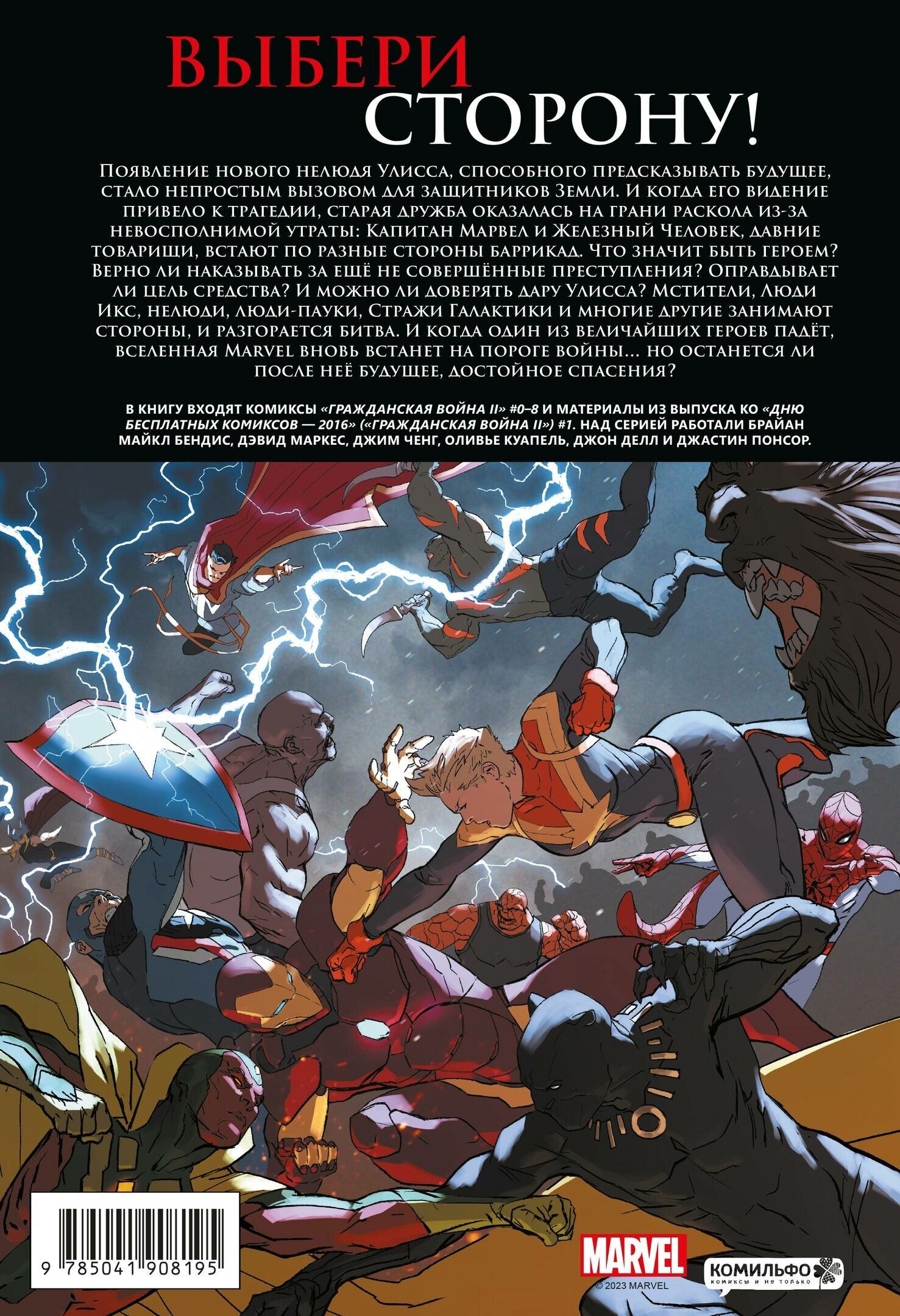 Появление нового нелюдя Улисса, способного предсказывать будущее, стало непростым вызовом для защитников Земли. И когда его видение привело к трагедии, старая дружба оказалась на грани раскола из-за невосполнимой утраты: Капитан Марвел и Железный Человек, давние товарищи, встают по разные стороны баррикад. Что значит быть героем? Верно ли наказывать за ещё не совершённые преступления? Оправдывает ли цель средства? И можно ли доверять дару Улисса? Мстители, Люди Икс, нелюди, люди-пауки, Стражи Галактики и многие другие занимают стороны, и разгорается битва. И когда один из величайших героев падёт, вселенная Marvel вновь встанет на пороге войны… но останется ли после неё будущее, достойное спасения?