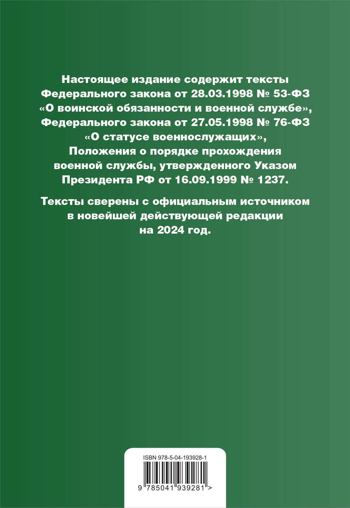 Издание содержит тексты нормативных правовых актов, регулирующих вопросы военной службы в новейшей действущей редакции на 2024 год (с учетом поправок о добровольческих формированиях). В сборник включены тексты федеральных законов от 28.03.1998 № 53-ФЗ "О воинской обязанности и военной службе" и от 27.05.1998 № 76-ФЗ "О статусе военнослужащих", Положения о порядке прохождения военной службы, утвержденного Указом Президента РФ от 16.09.1999 № 1237.