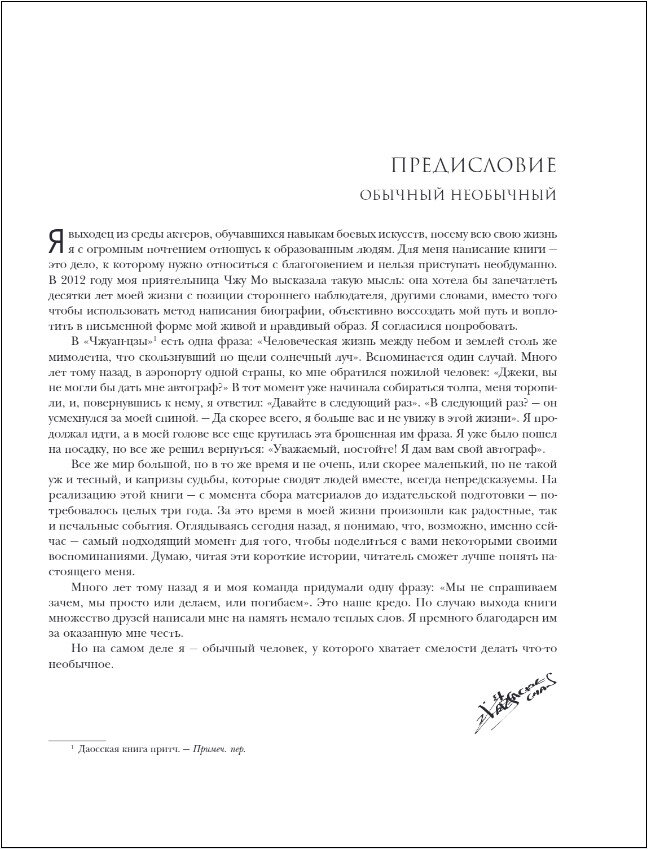 Возможно, этих ярких историй читатель никогда бы не увидел, если бы Чжу Мо, подруга Джеки Чана, однажды не предложила ему: «А давай сделаем книгу?» В течение трех лет Чжу Мо ежедневно записывала его воспоминания и приводила в логический порядок, добавляя к ним свои личные истории о работе с кумиром миллионов людей.