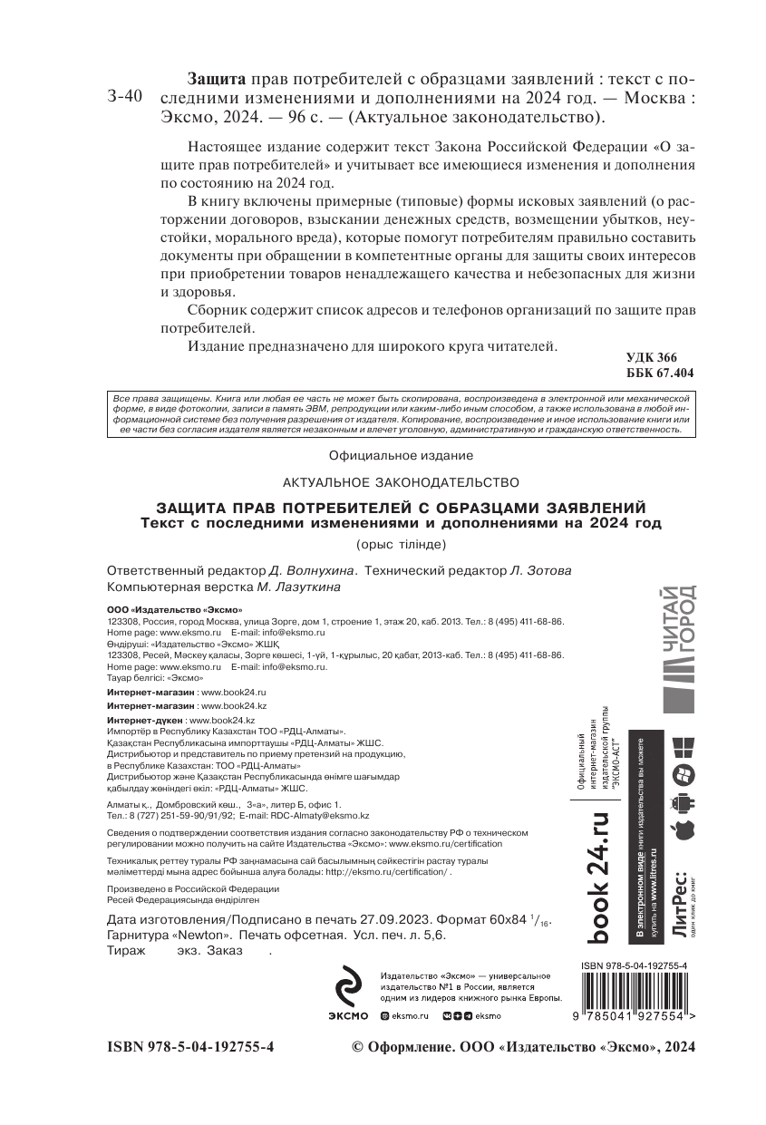 Защита прав потребителей с образцами заявлений. В ред. на 2024 год (без автора); ООО "Издательство "Эксмо", 2023