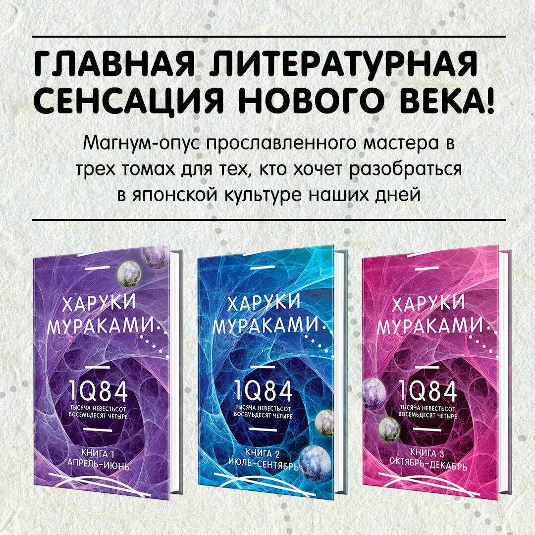 В комплект «1Q84. Тысяча Невестьсот Восемьдесят Четыре» входят три части этого романа Харуки Мураками.