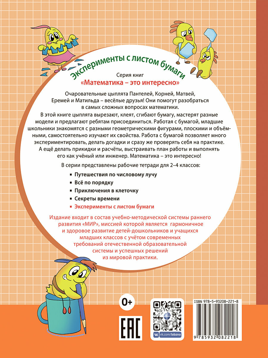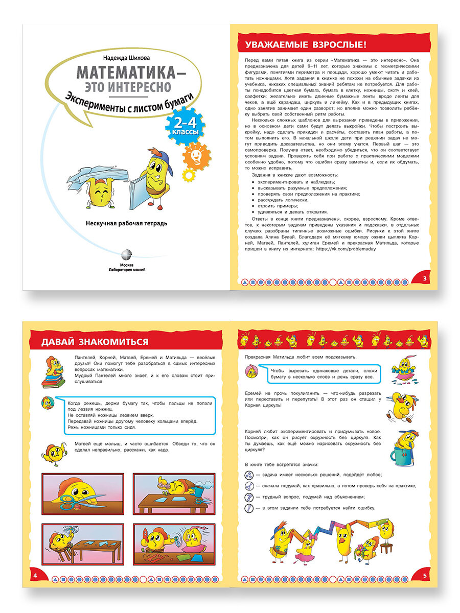 Книга предназначена для развития креативности и математического мышления у младших школьников. Адресована детям, которые знакомы с геометрическими фигурами, понятиями периметра и площади, хорошо умеют читать и работать ножницами. Для работы понадобится цветная бумага, бумага в клетку, ножницы, скотч и клей, а ещё карандаш, циркуль и линейка. Герои книги — весёлые друзья-цыплята — помогут в разгадывании математических загадок.