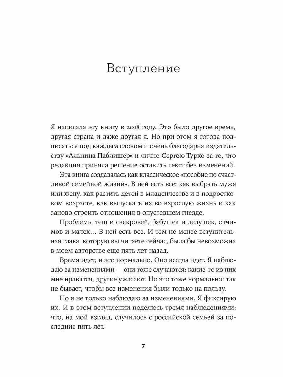 Хорошая семья — это надежная крепость, которая устоит во время невзгод и где все помогают друг другу; группа поддержки, в которой крепки эмоциональные узы и можно без страха говорить обо всем на свете. Такую семью удалось создать телеведущей, опытному журналисту, бизнес-тренеру и коучу Нине Зверевой. Уже много лет она ведет насыщенную и увлекательную профессиональную жизнь, дома ее ждет любящий супруг, а дети и внуки радуют и удивляют. В чем же секрет счастливой семьи, где все живут душа в душу? Нина Витальевна уверена, что важную роль играют правила, ценности и традиции, а еще — умение оказываться рядом с близкими в трудной ситуации, но не пытаться их контролировать. В ее книге вы найдете маленькие секреты семейной жизни, полезные советы на каждый день, подлинные истории и размышления об отношениях. А также подсказки, как выбирать партнера, растить детей, вовремя выпускать их во взрослую жизнь и заново строить отношения в опустевшем гнезде. А главное, убедитесь, что любовь существует, а хорошая дружная семья — и есть самое большое счастье на свете.