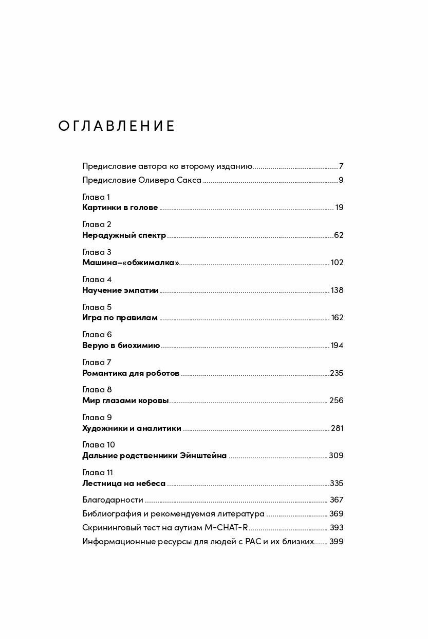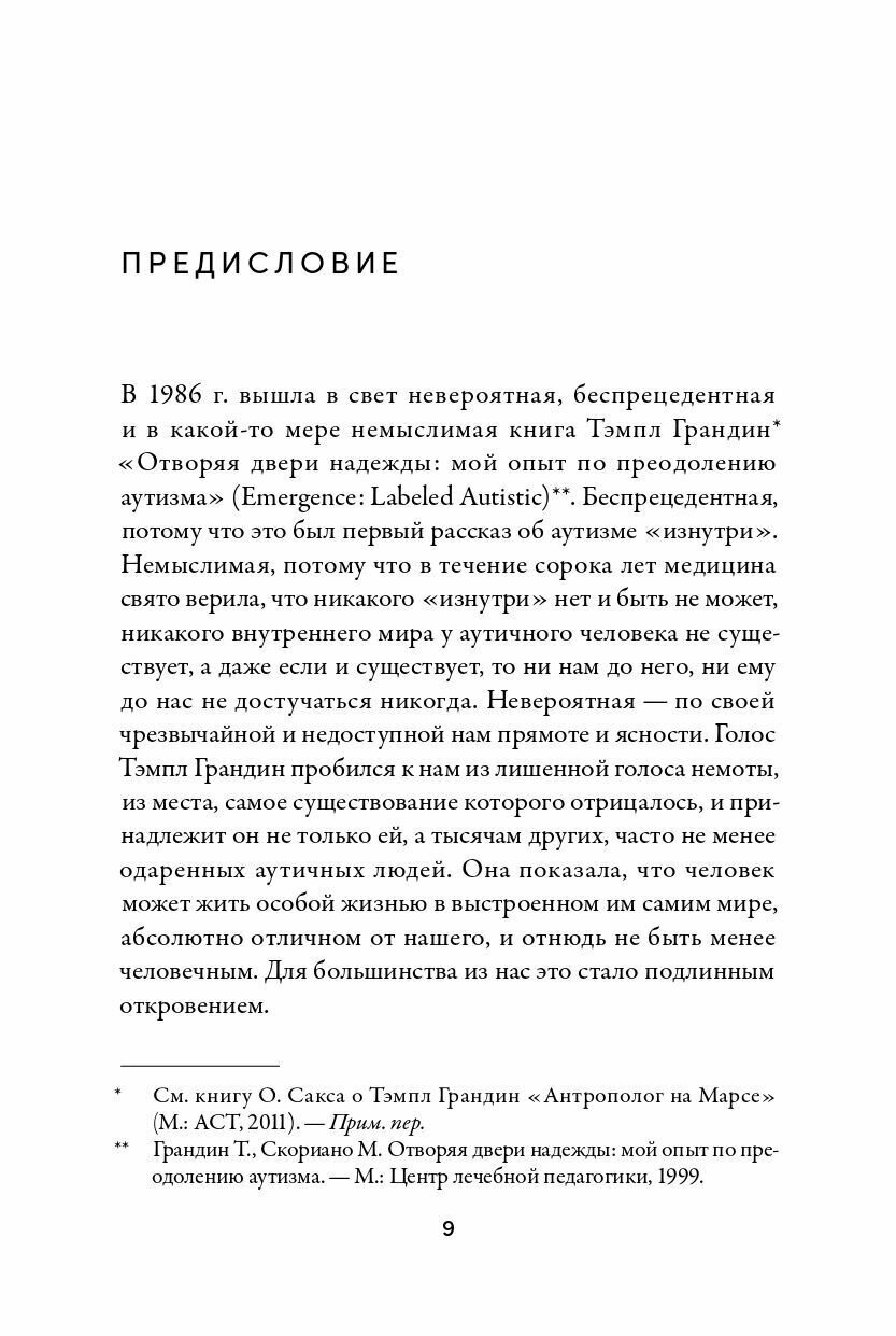 Тэмпл Грандин получила всемирную известность, став первым человеком, публично рассказавшим об опыте жизни с расстройством аутистического спектра. Ее книга — прямой репортаж из «мира аутизма», и Грандин, которая пишет одновременно с точки зрения аутичного человека и с позиций ученого, рассказывает, как этот мир воспринимается его обитателями и как ей самой удалось выбраться за его границы, чтобы максимально полноценно функционировать в мире внешнем.