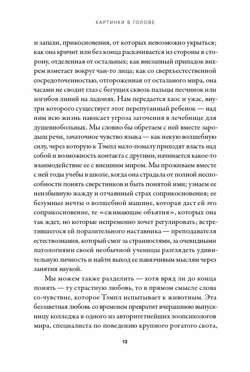 Одна из загадок аутичного сознания — замечательная способность к развитию визуально-пространственных навыков при явных сложностях с развитием навыков вербальных. Грандин показывает различия между своей жизнью человека с визуальным мышлением и жизнью тех, кто думает словами. Это окно, через которое мы можем заглянуть внутрь сознания совсем иного типа. Невероятно интересная и очень трогательная, книга Тэмпл Грандин служит мостом между нашим миром и миром, в котором живут люди, думающие, чувствующие и воспринимающие все вокруг совершенно иначе.