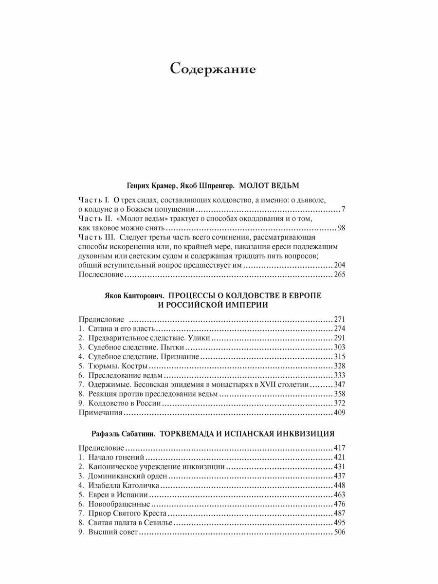 Сборник содержит три культовые работы, посвященные этим и другим вопросам истории охоты на ведьм: «Молот ведьм» Г. Крамера и Я. Шпренгера, «Процессы о колдовстве в Европе и Российской империи» Я. Канторовича и «Торквемада и испанская инквизиция» Р. Сабатини.