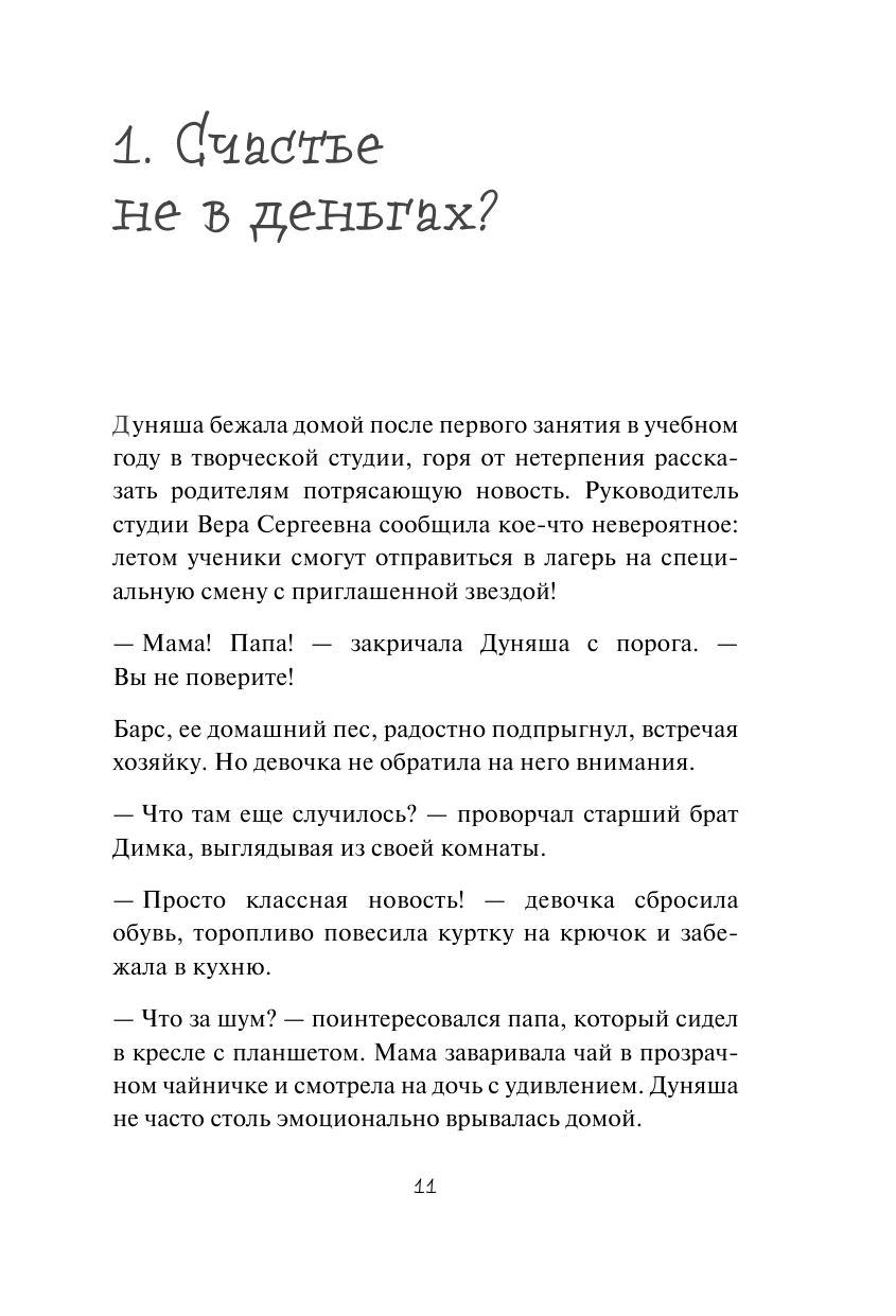 Провести смену в летнем лагере вместе со своим кумиром - тринадцатилетняя Дуняша чуть с ума не сошла от радости, когда узнала о такой возможности! Но ее родители оказались против: 30 000 рублей за 5 дней – слишком дорого! И Дуняша решает заработать на поездку сама. Вместе с братом Димой, лучшей подругой Леной и одноклассником Глебом она отправляется в большое "денежное приключение". В нем у каждого из ребят есть своя цель и свой способ заработка. При этом все участники "денежного приключения" поддерживают и помогают друг другу.
