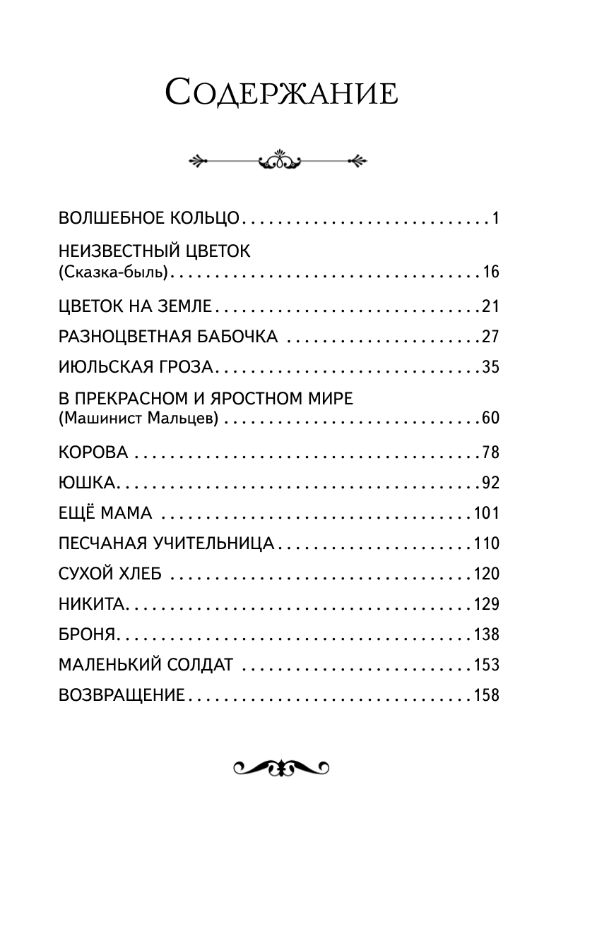 В книгу вошло 15 рассказов и сказок выдающегося русского советского писателя Андрея Платонова. В их числе такие известные произведения, как «Юшка», «Корова», «Сухой хлеб». По сказке «Волшебное кольцо» снят полнометражный мультфильм.
