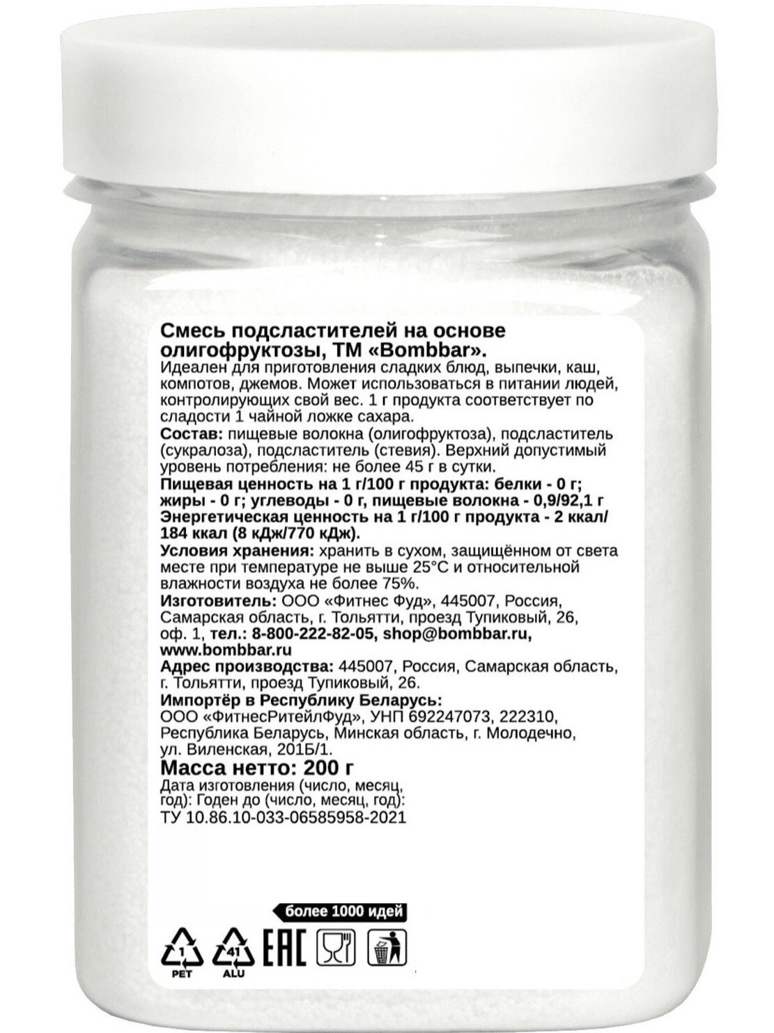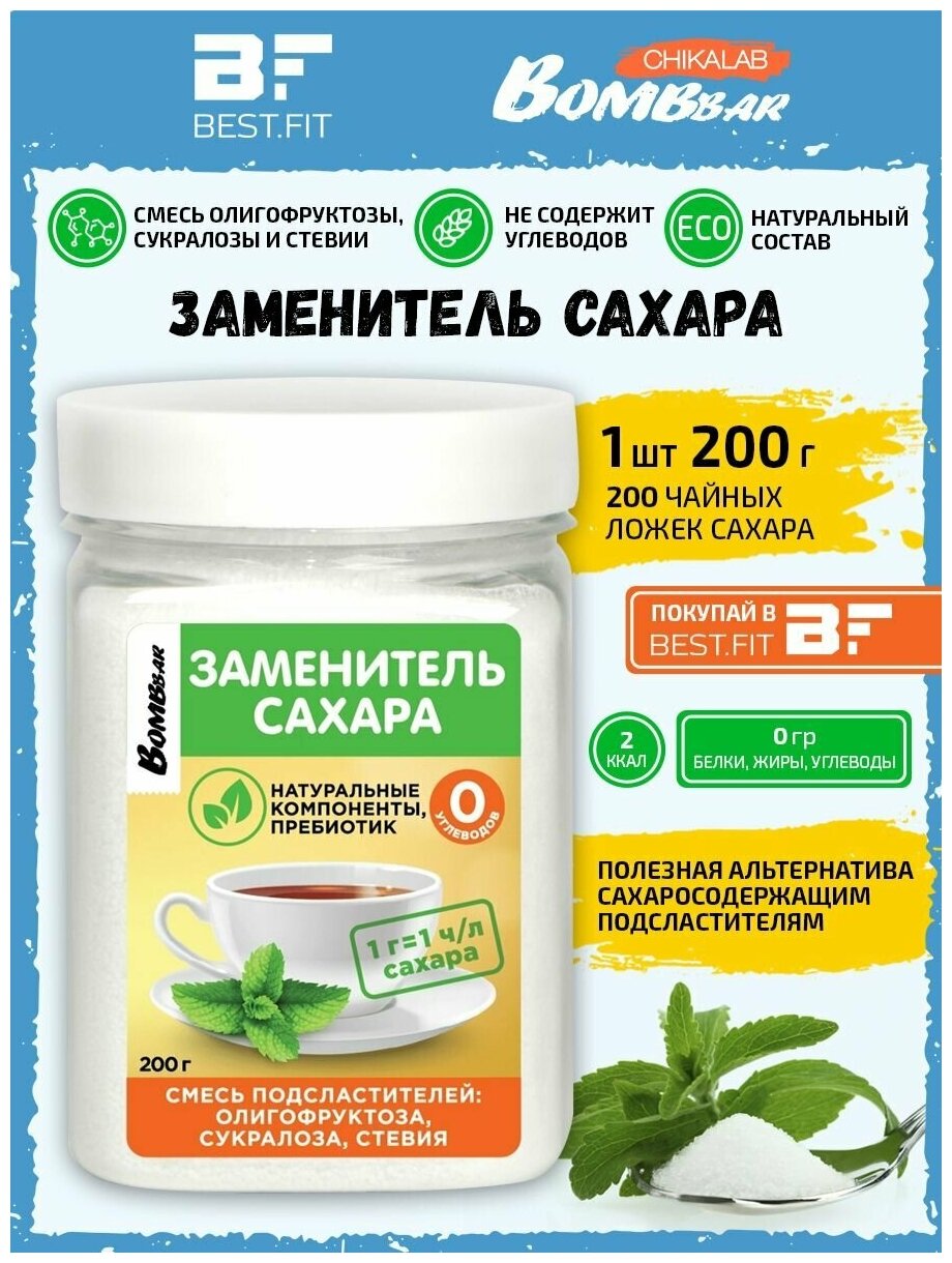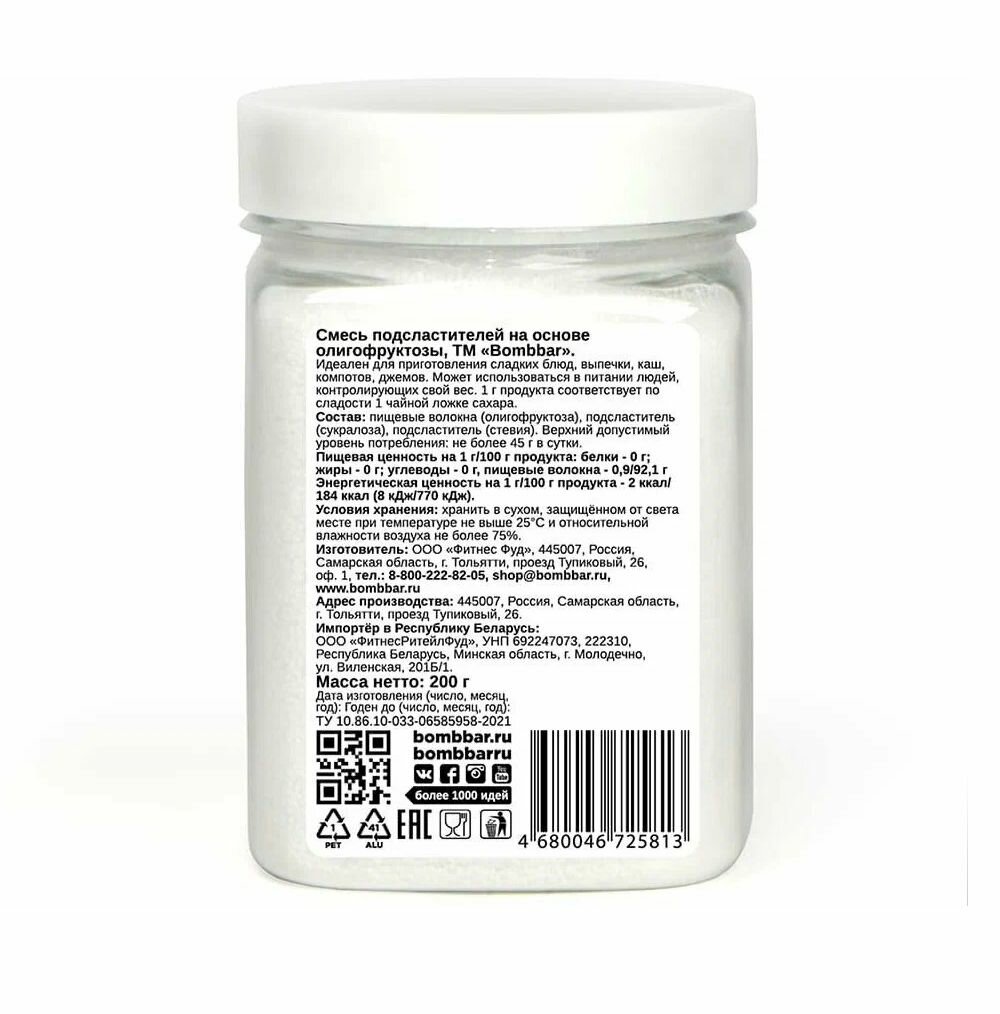 Смесь подсластителей на основе олигофруктозы Bombbar 200г ООО Фитнес Фуд (2664470)