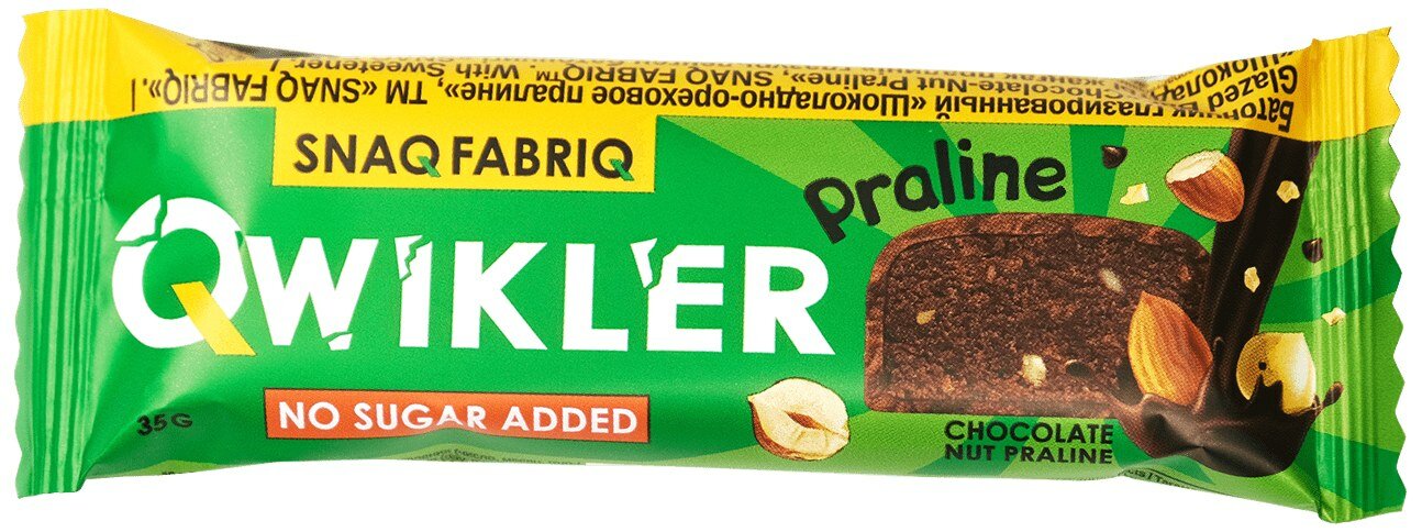 """Батончик с невероятно нежной начинкой из шоколадно-орехового пралине в тонкой оболочке из традиционного молочного шоколада без сахара. Преимущества: - минимум углеводов, без сахара; - без пальмового масла; - содержит клетчатку. Кусочки обжаренных орехов в сочетании с вафельной крошкой деликатно раскрывают тонкий вкус начинки. QWIKLER PRALINE - ваш новый источник вдохновения!"""