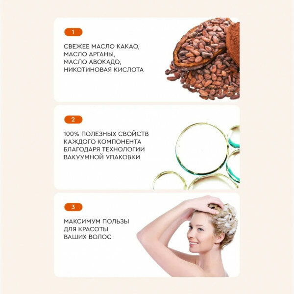 | Химический состав | Theobroma Cacao Seed Butter (Масло Какао), Olea Europaea Fruit Oil (Масло Оливы), Aqua, Cetearyl Alcohol, Distearoylethyl Dimonium Chloride, Niacin (Никотиновая Кислота), Glyceryl Stearate, Argania Spinosa Kernel Oil (Масло Арганы), Persea Gratissima Oil (Масло Авокадо), Inulin, Parkia Biglobosa Oligosaccharides (Пребиотики), Benzyl Alcohol, Ethylhexylglycerin, Caramel, Parfum. |