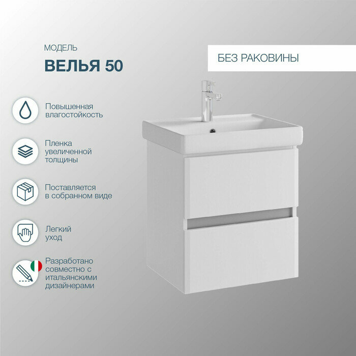 Тумба подвесная SanStar Велья 50 Без раковины для ванной комнаты белая производится на российском заводе, оснащенном высокотехнологичным европейским оборудованием под брендом SanStar. Под контролем отдела качества, с соблюдением ТУ и ГОСТ. Товар относится к серии Практик, отличительной особенностью которой являются оптимальное соотношение качества и цены. Линейка мебели Велья, выполненная в современном стиле, внесет в Вашу ванную комнату неповторимый дизайн и обновление. Для изготовления корпуса используется влагостойкий ЛДСП - покрытие матовое, фасад изготавливается из МДФ. Для покрытия фасада изделия используется высококачественная глянцевая пленка увеличенной толщины. Два выдвижных ящика с направляющими скрытого монтажа и доводчиками Boyard.
