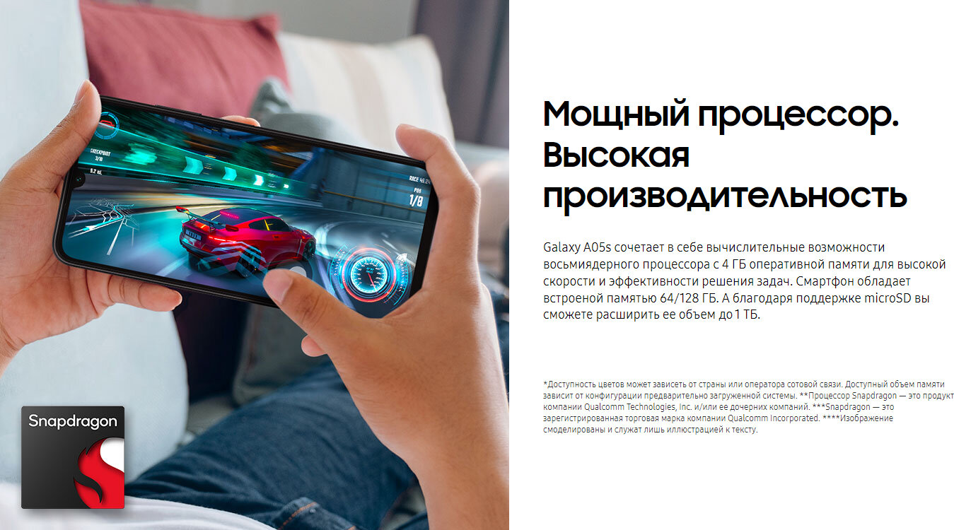 | Дополнительно * | Samsung Galaxy A05s — современный смартфон от известного бренда с безрамочным дизайном и мощным процессором. Работает на ОС Android., , Преимущества, , Модули GPS и ГЛОНАСС., Поддержка Wi-Fi и Bluetooth., Есть связь VoLte., 4 ГБ ОЗУ., 128 ГБ встроенной памяти, есть возможность установить карту памяти объемом до 1 ТБ., Функциональные особенности, , В Samsung Galaxy A05s установлен инновационный экран IPS PLS LCD HD+ диагональю 6.7 дюймов (2400x1080) с комфортным соотношением сторон 20:9. Безрамочный дизайн делает просмотр фильмов и клипов еще более захватывающим. За производительность отвечает 8-ядерный процессор Qualcomm Snapdragon 680 с частотой 2400 МГц., , Тыловая камера оснащена тремя объективами — широкоугольный 50 МП, макрообъектив 2 МП и датчик глубины 2 МП. Такой набор позволяет делать снимки любого формата — от масштабных пейзажей до портретов. Предусмотрен 10-кратный цифровой зум., , Удобство эксплуатации, , Samsung Galaxy A05s поставляется в пластиковом корпусе, защищенном от ударов и брызг воды. В смартфоне установлен литий-полимерный аккумулятор на 5000 мАч. Есть функция быстрой зарядки. |