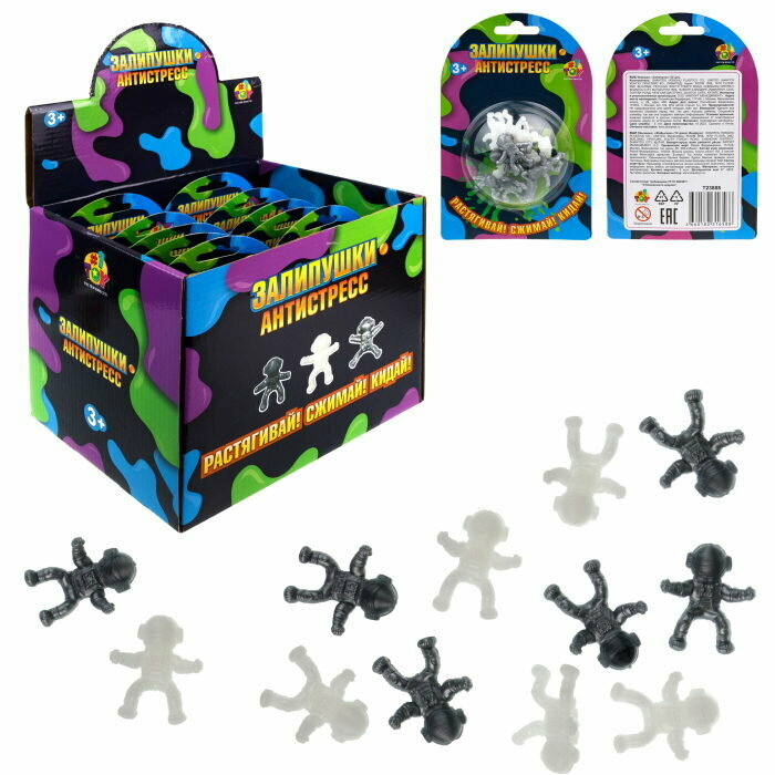 Детская игрушка-антистресс "Залипушки" от бренда 1TOY представлена в блистере в ассортименте (4 вида): серо-белые астронавты, разноцветные пауки, разноцветные единороги, скелеты (светятся в темноте). Растягивай, сжимай и кидай залипушки! Они прилипают к ровной поверхности (окно/зеркало), если кинуть, и забавно медленно сами опускаются вниз! Размер одной игрушки: 2 см. Игрушка развивает мелкую моторику, воображение, предназначена для детей от трех лет. Материал: полимерные материалы.