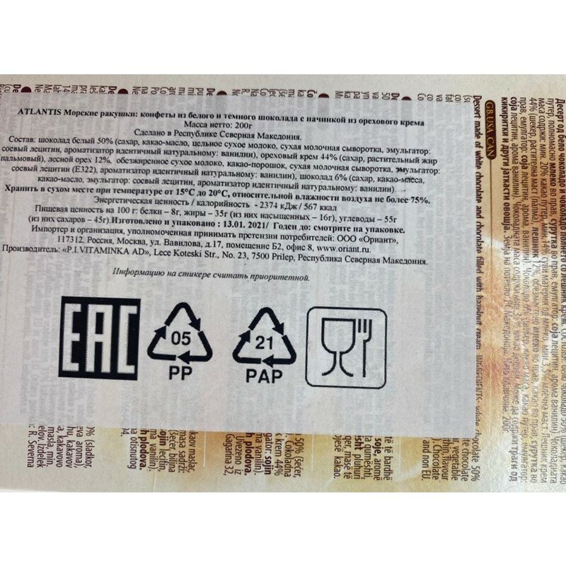 | Состав | шоколад белый 50% (сахар, какао-масло, цельное сухое молоко, лактоза, эмульгатор |