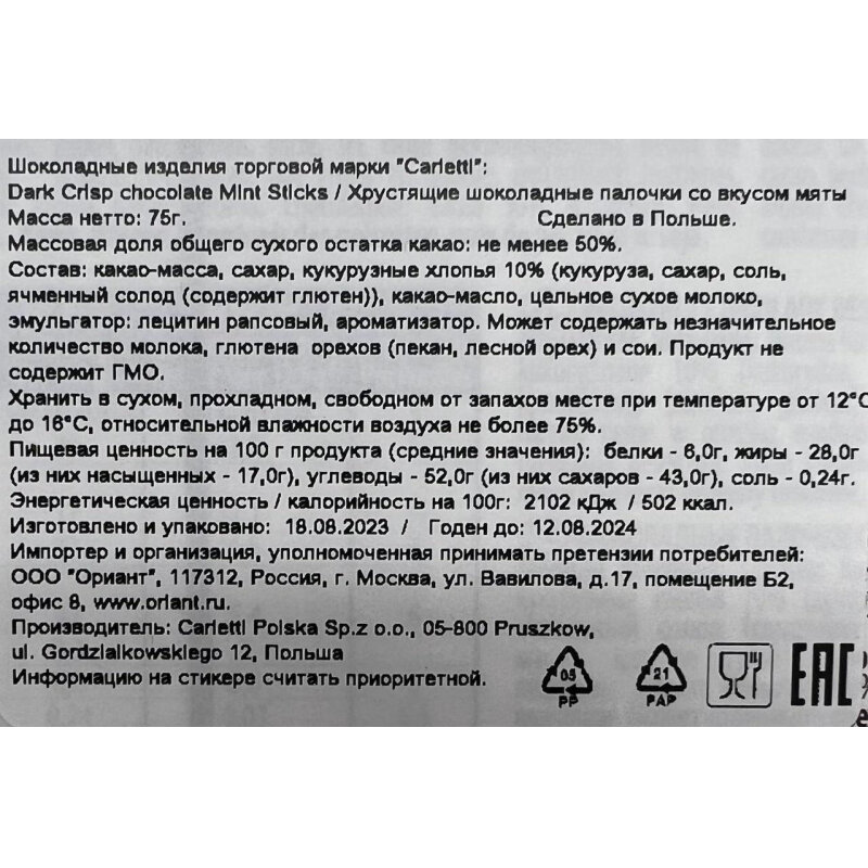 Сервис сравнения цен СкидкаГИД предлагает сравнить цены на товар «Палочки шоколадные Сarletti Тростник со вкусом мяты 75 г»