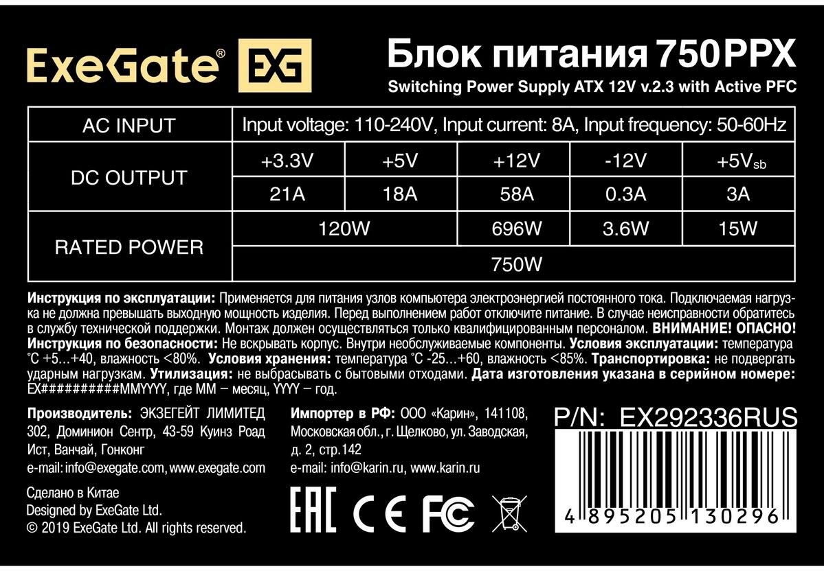 Блок питания ExeGate 750W 750PPX black (EX292336RUS)