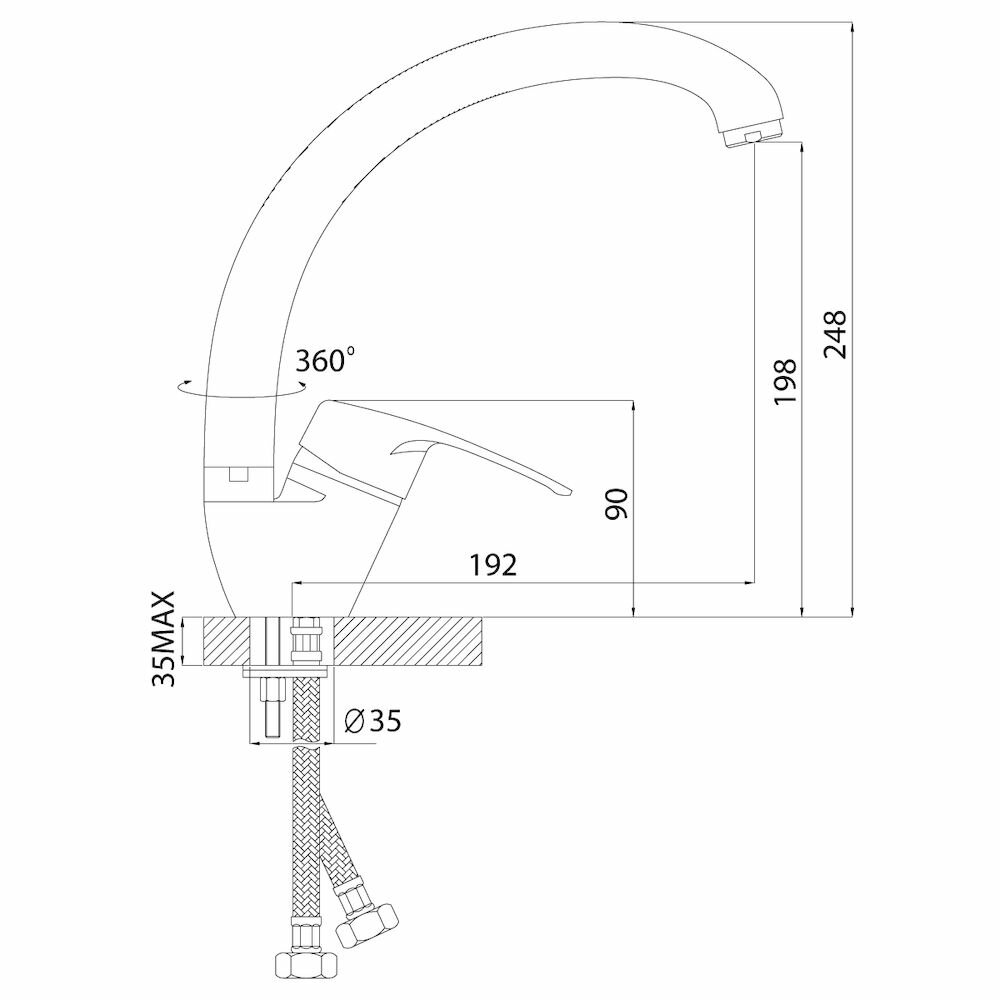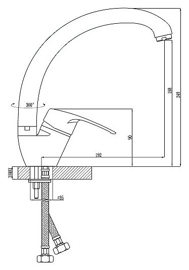 С высоким изливом. Картридж с керамическими пластинами Ф40. Гибкая подводка 400 мм. 1/2 дюйма -2 шт. Пластиковый аэратор с функцией «Анти-Кальций». Поворотный излив. Присоединительная группа для горизонтального крепления.