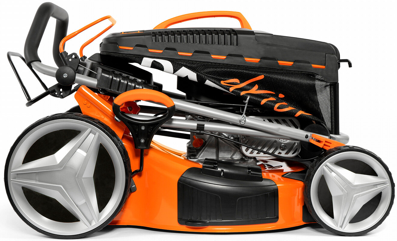 - Травосборник с индикатором заполнения на 70 л обеспечивает аккуратное кошение, не давая отходам разлетаться. Также имеется функция бокового выброса и мульчирования.