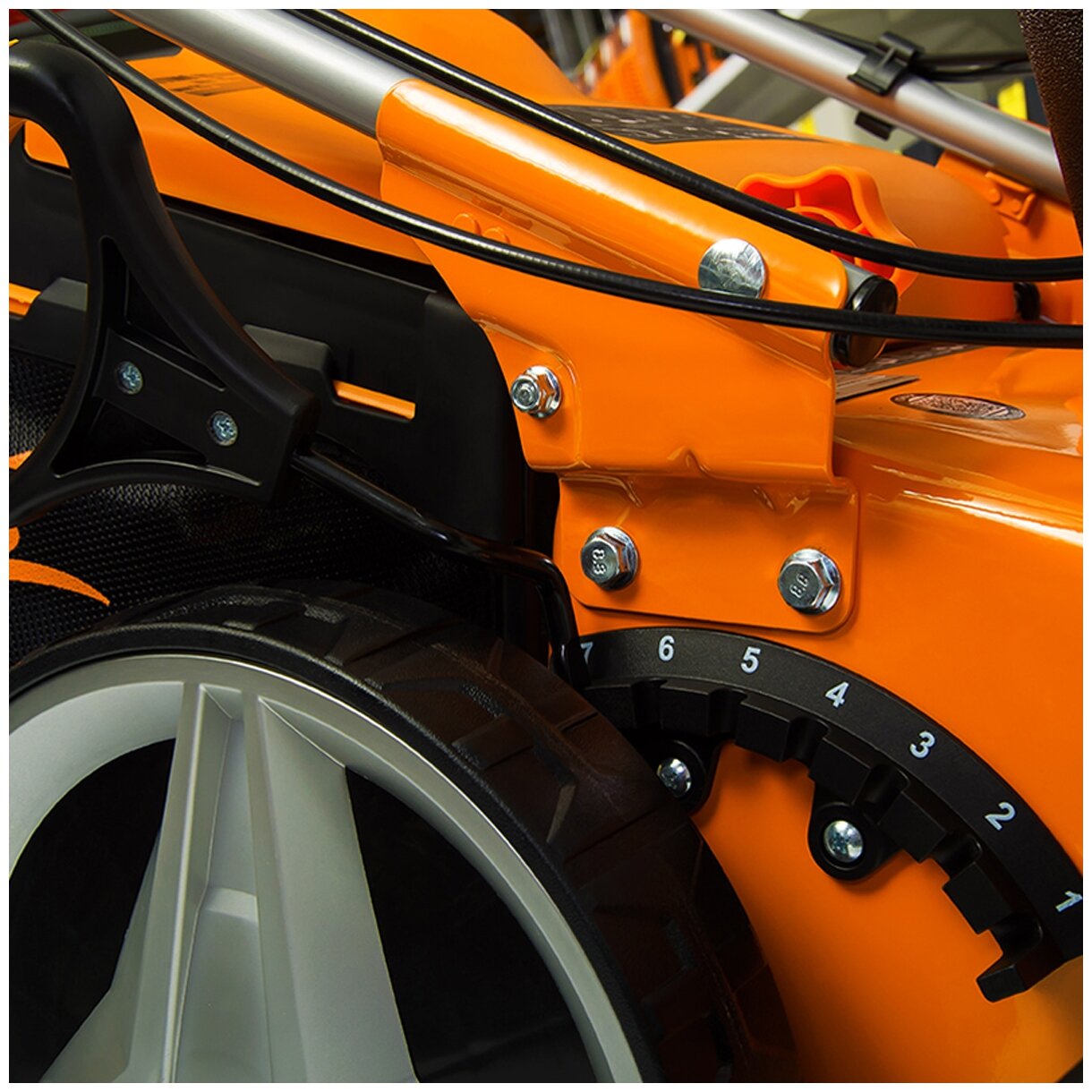 - Высота среза регулируется в одно движение при помощи центрального рычага.