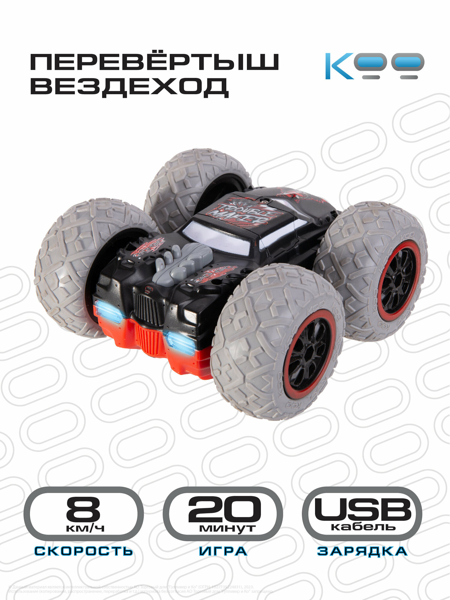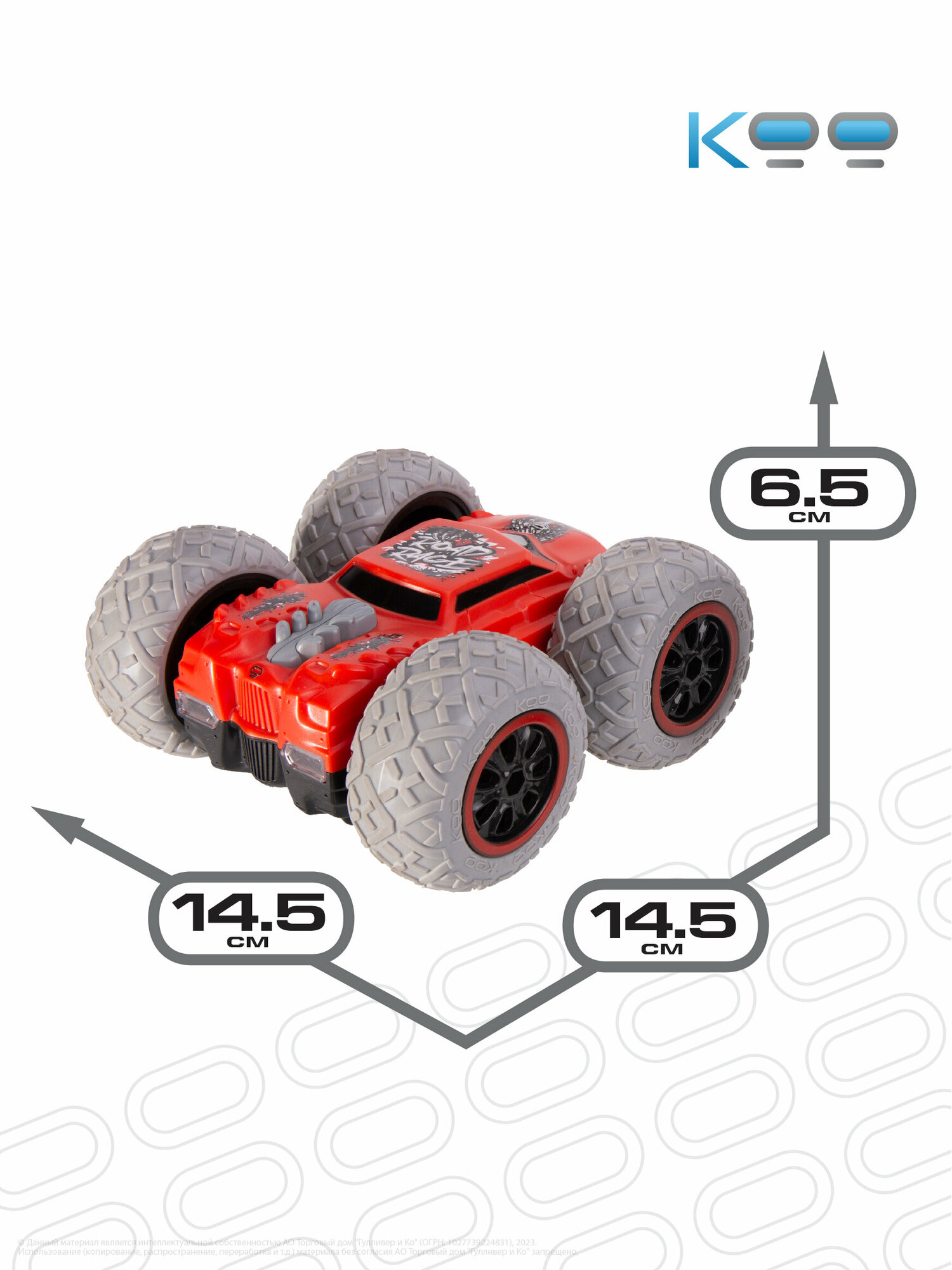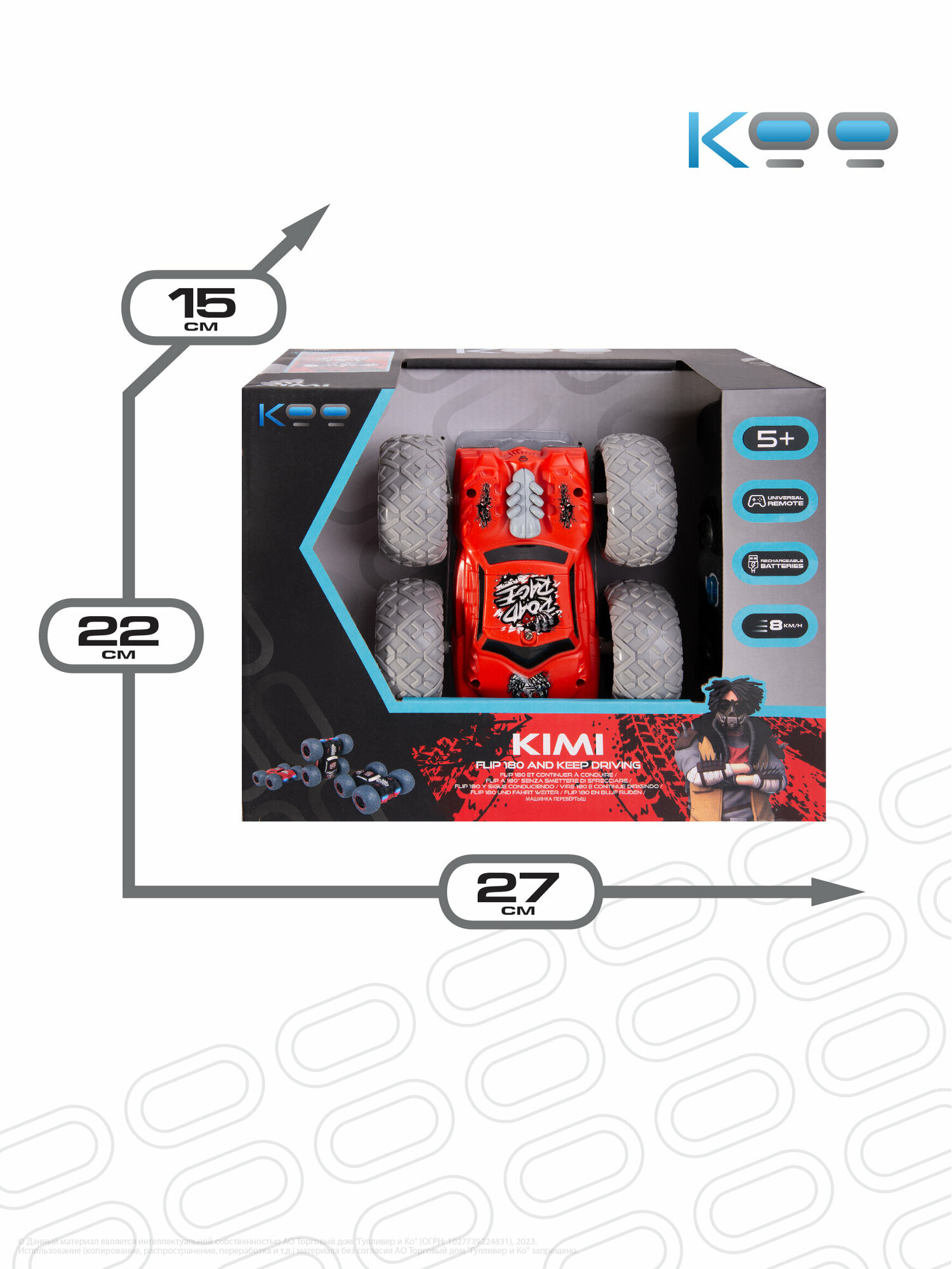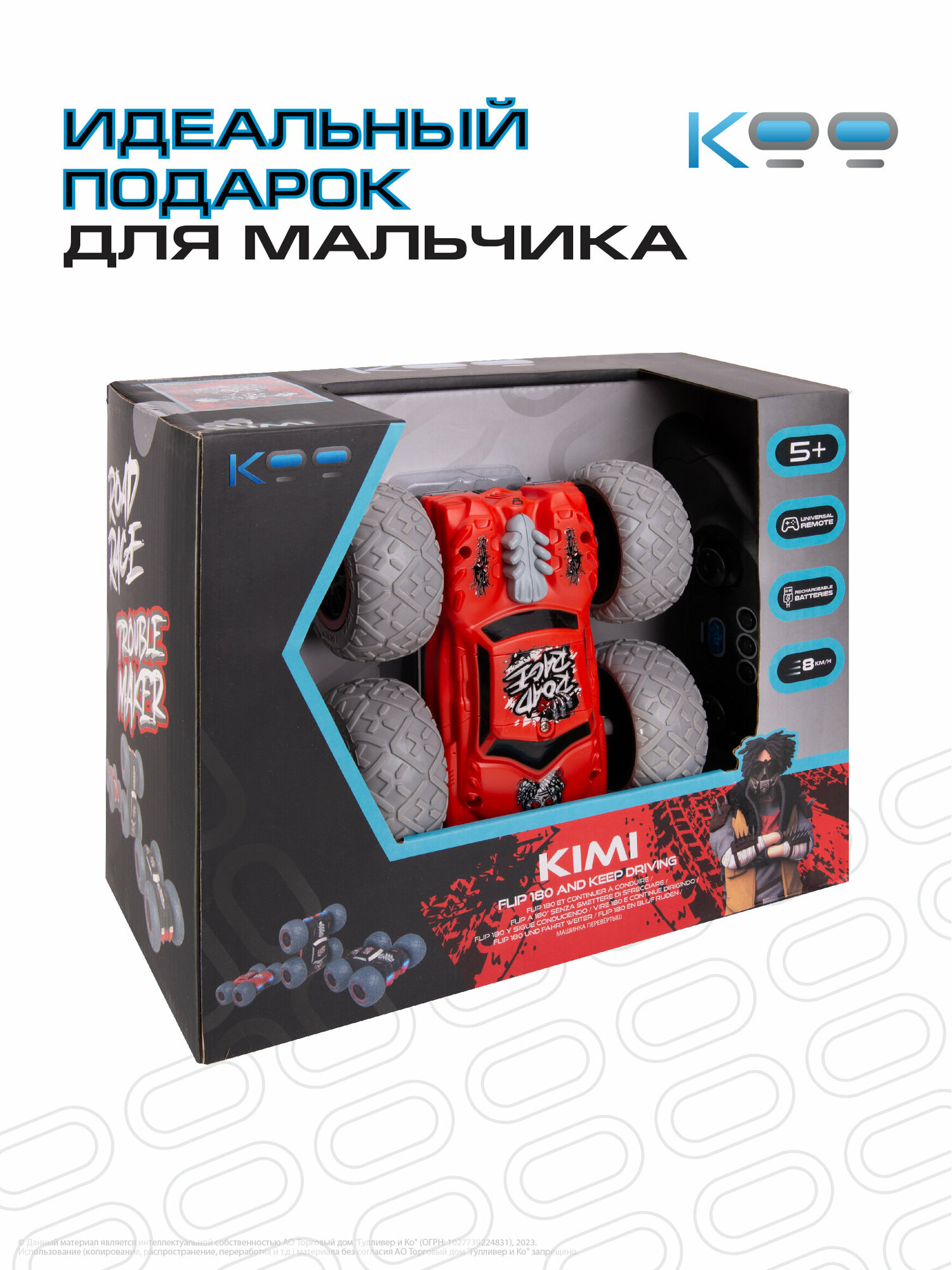 Размер машинки: 14,5 х 14,5 х 6,5 см. Размер упаковки: 27 х 15 х 22 см. Частота дистанционного управления - 2,4 GHz. Мощная аккумуляторная батарея 3,7V 500mAh Li-ion. Игровое время - 20 минут. Скорость машинки – 8 км/ч. Беспроводной пульт поставляется в наборе, для него необходимы 3 батарейки 1,5V AAA (не входят в комплект). Включение и выключение подсветки фар, включение режима езды в хаотичном направлении, движение вперёд/назад, движение влево/вправо, движение вокруг своей оси, опрокидывание на крышу при столкновении с препятствиями. В комплекте с машинкой: универсальный пульт дистанционного управления, USB-кабель, аккумулятор, отвёртка, инструкция.Машинка перевёртыш на пульте управления Кими - это настоящая находка для всех любителей автомобилей и захватывающих гонок! Она отлично подойдёт как для мальчиков и девочек от 5 лет, так и для подростков и взрослых.Эта радиоуправляемая машинка для мальчиков благодаря своему яркому дизайну и уникальному японскому стилю подарит вам незабываемые эмоции от игры!Игрушка на радиоуправлении Кими разгоняется до 8 км/ч, а при опрокидывании на крышу – продолжает движение вперёд и преодолевает любые препятствия у себя на пути, будь то бордюр или стена. Яркие светящиеся фары игрушки на радиоуправлении и шины для любого покрытия при езде по асфальту, песку или полу, делают её ещё более функциональной и неуязвимой на дорогах! Такая радиоуправляемая машинка даст возможность детям и взрослым испытать максимум эмоций и адреналина на протяжении 20 минут!Заряжается эта гоночная машинка от аккумулятора с USB-кабелем, обеспечивая стабильную работу и увлекательную игру!Машинка перевёртыш на радиоуправлении Кими – это универсальный подарок для детей и взрослых на любой праздник: День Рождения, именины, 8 марта, 23 февраля, Новый год. Не упустите возможность порадовать себя или своих близких яркими моментами и подарите им ощущения настоящего адреналина! В линейке игрушек на радиоуправлении от бренда КОО вы также можете найти такие модели, как Котаро, Кинчика, Погтадор и другие! Соберите всю коллекцию машинок и устраивайте настоящие гонки, не выходя из дома!