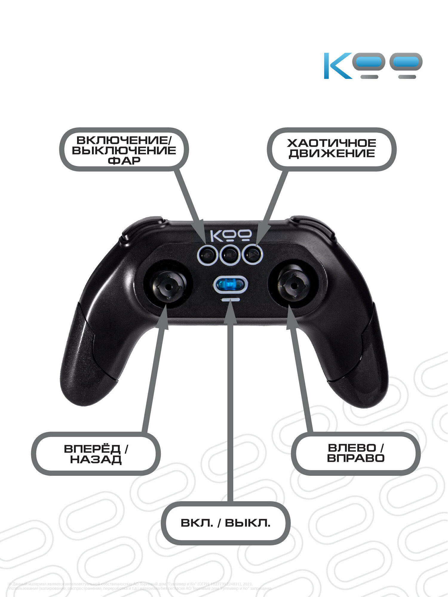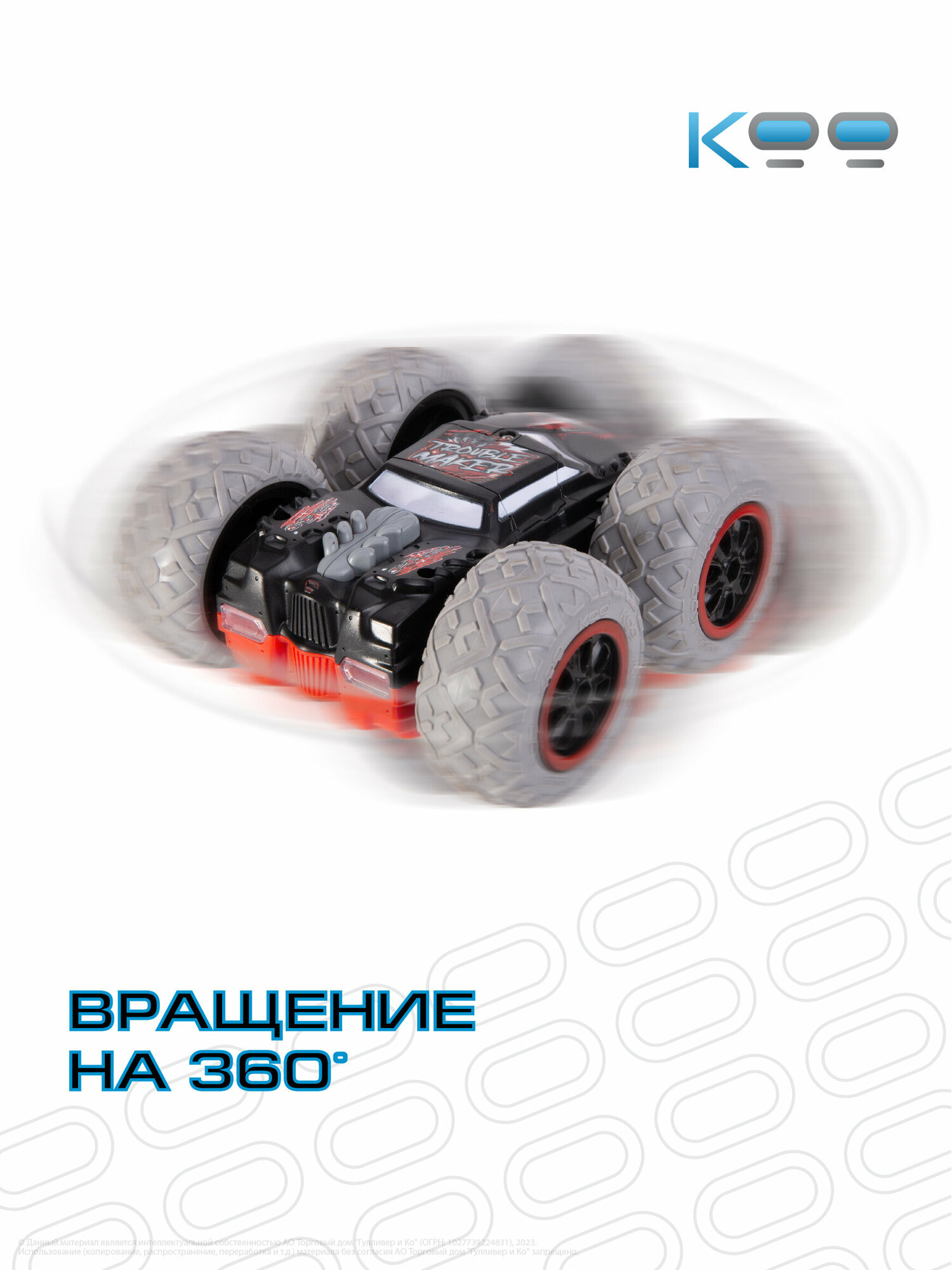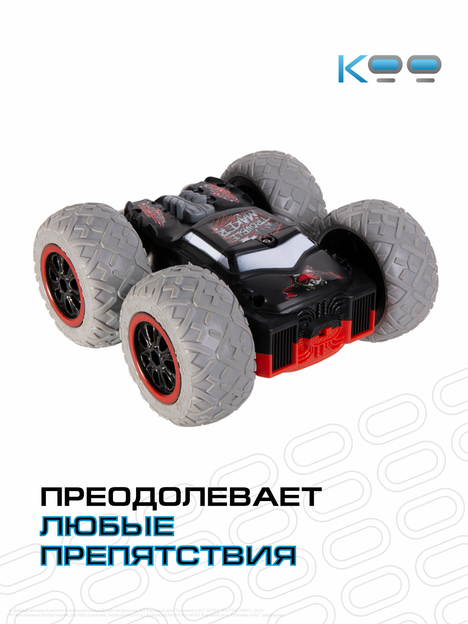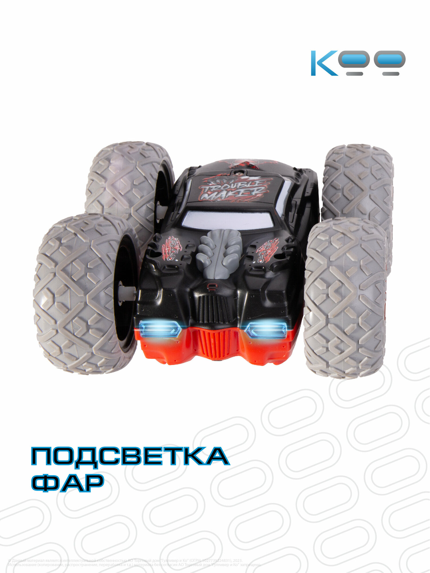 Размер машинки: 14,5 х 14,5 х 6,5 см. Размер упаковки: 27 х 15 х 22 см. Частота дистанционного управления - 2,4 GHz. Мощная аккумуляторная батарея 3,7V 500mAh Li-ion. Игровое время - 20 минут. Скорость машинки – 8 км/ч. Беспроводной пульт поставляется в наборе, для него необходимы 3 батарейки 1,5V AAA (не входят в комплект). Включение и выключение подсветки фар, включение режима езды в хаотичном направлении, движение вперёд/назад, движение влево/вправо, движение вокруг своей оси, опрокидывание на крышу при столкновении с препятствиями. В комплекте с машинкой: универсальный пульт дистанционного управления, USB-кабель, аккумулятор, отвёртка, инструкция.Машинка перевёртыш на пульте управления Кими - это настоящая находка для всех любителей автомобилей и захватывающих гонок! Она отлично подойдёт как для мальчиков и девочек от 5 лет, так и для подростков и взрослых.Эта радиоуправляемая машинка для мальчиков благодаря своему яркому дизайну и уникальному японскому стилю подарит вам незабываемые эмоции от игры!Игрушка на радиоуправлении Кими разгоняется до 8 км/ч, а при опрокидывании на крышу – продолжает движение вперёд и преодолевает любые препятствия у себя на пути, будь то бордюр или стена. Яркие светящиеся фары игрушки на радиоуправлении и шины для любого покрытия при езде по асфальту, песку или полу, делают её ещё более функциональной и неуязвимой на дорогах! Такая радиоуправляемая машинка даст возможность детям и взрослым испытать максимум эмоций и адреналина на протяжении 20 минут!Заряжается эта гоночная машинка от аккумулятора с USB-кабелем, обеспечивая стабильную работу и увлекательную игру!Машинка перевёртыш на радиоуправлении Кими – это универсальный подарок для детей и взрослых на любой праздник: День Рождения, именины, 8 марта, 23 февраля, Новый год. Не упустите возможность порадовать себя или своих близких яркими моментами и подарите им ощущения настоящего адреналина! В линейке игрушек на радиоуправлении от бренда КОО вы также можете найти такие модели, как Котаро, Кинчика, Погтадор и другие! Соберите всю коллекцию машинок и устраивайте настоящие гонки, не выходя из дома!