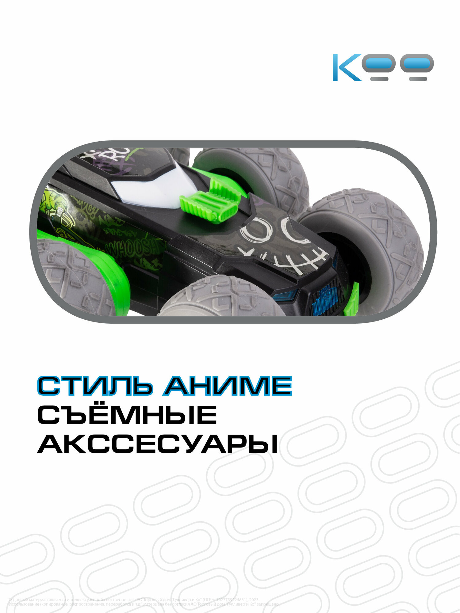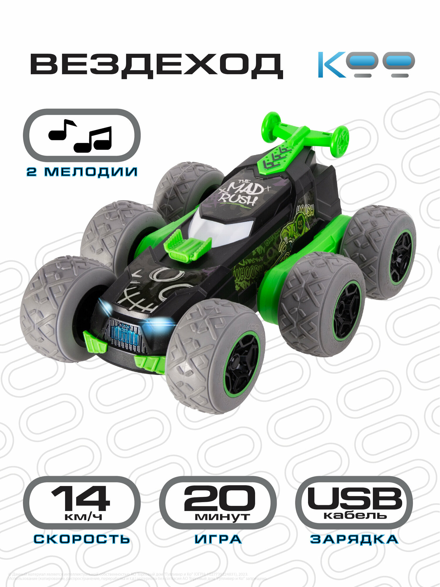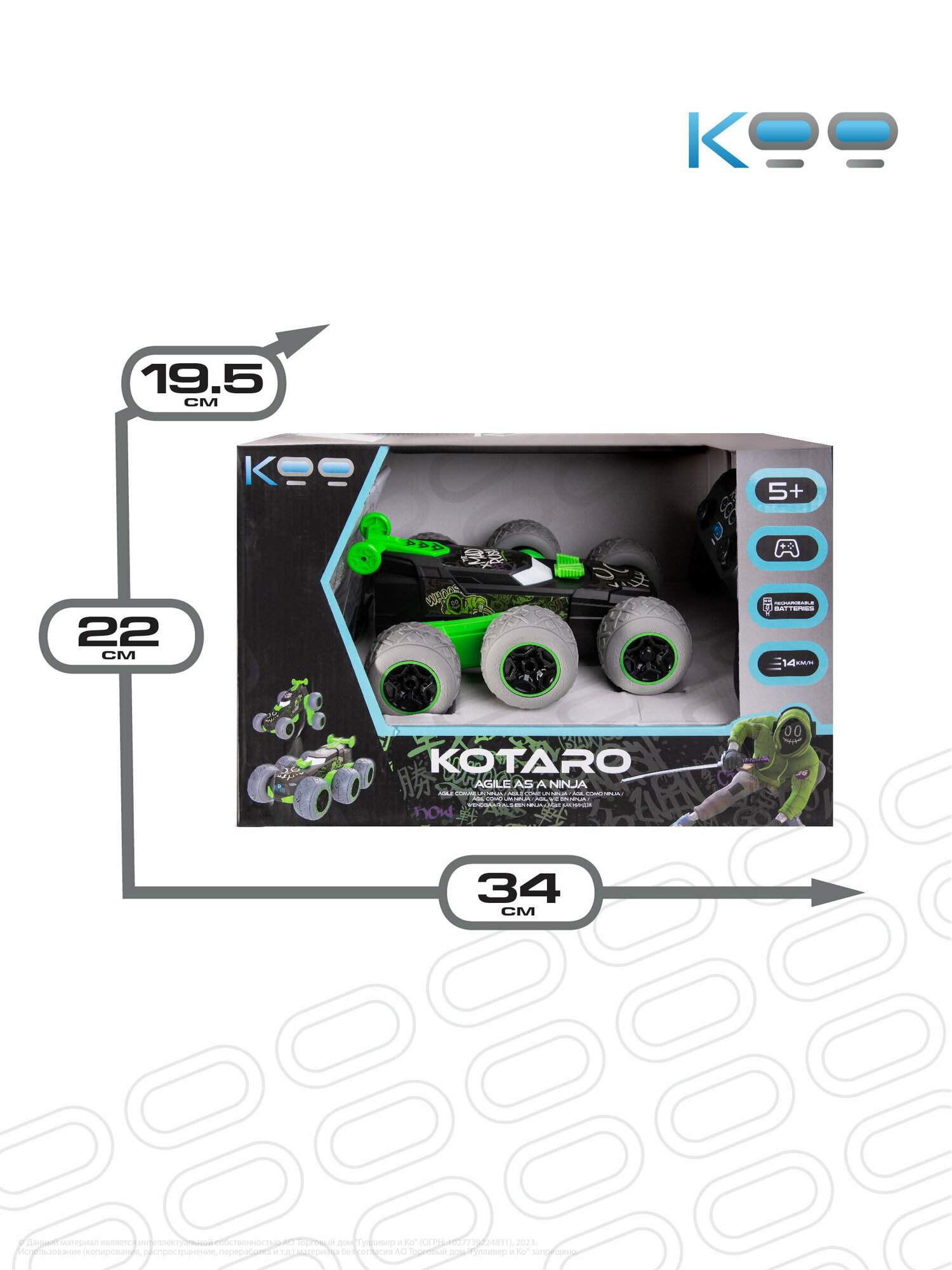 Размер машинки: 19 х 17 х 9,5 см. Размер упаковки: 34 х 19,5 х 22 см. Частота дистанционного управления - 2,4 GHz. Мощная аккумуляторная батарея 3,7V 1200mAh Li-ion. Игровое время - 20 минут. Скорость машинки – 14 км/ч. Беспроводной пульт поставляется в наборе, для него необходимы 3 батарейки 1,5V AAA (не входят в комплект). Включение и выключение подсветки фар, включение и выключение звука, переключение между звуковыми мелодиями, режим управления задними колёсами, включение режима езды в хаотичном направлении, движение вперёд/назад, движение влево/вправо. В комплекте с машинкой: универсальный пульт дистанционного управления, USB-кабель, аккумулятор, отвёртка, инструкция.Машинка вездеход на радиоуправлении Котаро – это увлекательная игрушка, которая позволит вам и вашему ребенку ощутить себя настоящим гонщиком! Машинка для мальчиков на пульте управления Котаро создана в уникальном японском стиле с множеством стильных автомобильных аксессуаров и ярким дизайном!Мощные функционал данной модели радиоуправляемой машины не оставит вас равнодушным! Яркие светящиеся фары и звуковые эффекты позволят погрузиться в атмосферу гонок и почувствовать настоящий драйв и скорость! 4 двигателя для сильной тяги на бездорожье и независимая подвеска задних колёс, управляемая с пульта, позволят преодолевать любые сложные и высокие препятствия на дрогах. Мощные шины, предназначенные для любого покрытия при езде по асфальту, песку или полу, гоночной машинки вездеход позволяют преодолевать любые препятствия и наслаждаться игрой без каких-либо ограничений.Машина на пульте управления Котаро развивает скорость до 14 км/ч, а мощный аккумулятор с USB-кабелем обеспечит стабильную работу игрушки и позволит насладиться игрой на протяжении 20 минут!Радиоуправляемая машинка Котаро - это лучший способ провести время с пользой и удовольствием. Большой выбор функций и возможностей позволит воплотить в жизнь ваши самые смелые гоночные фантазии! Этот игрушечный автомобиль отлично подойдёт в качестве подарка девочкам и мальчикам от 5 лет, подросткам, и даже взрослым на любой праздник: День Рождения, именины, 23 февраля, 8 марта или Новый год.Насладитесь игрой вместе с другими моделями радиоуправляемых игрушек от КОО: Кими, Погтадор, Котаро и др.!