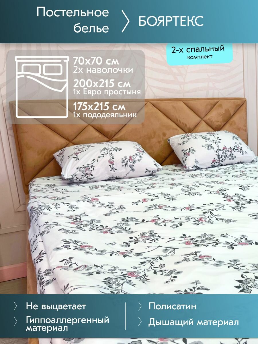 Комплект постельного белья Бояртекс - это сочетание стиля и комфорта. Выполненный из качественного материала - полисатина, этот комплект станет отличным выбором для тех, кто ценит комфорт и уют.Полисатин - это ткань, которая сочетает в себе прочность и мягкость. Благодаря этому, постельное белье из полисатина обеспечивает комфортный сон и долговечность.Дизайн комплекта постельного белья Бояртекс выполнен в классическом стиле с цветочным рисунком. Белый цвет белья придаст вашей спальне свежести и легкости, а также станет отличным фоном для ярких акцентов в интерьере.В комплект входят пододеяльник размером 175 х 215 см, две наволочки размером 70 х 70 см и простыня размером 200 х 215 см.Уход за комплектом постельного белья Бояртекс прост и не требует особых усилий. Стирка возможна при температуре до 30 градусов, что позволяет сохранить яркость и свежесть цвета на долгое время.Выбирая комплект постельного белья Бояртекс, вы получаете качественный продукт, который прослужит вам долгое время и подарит комфортный сон.