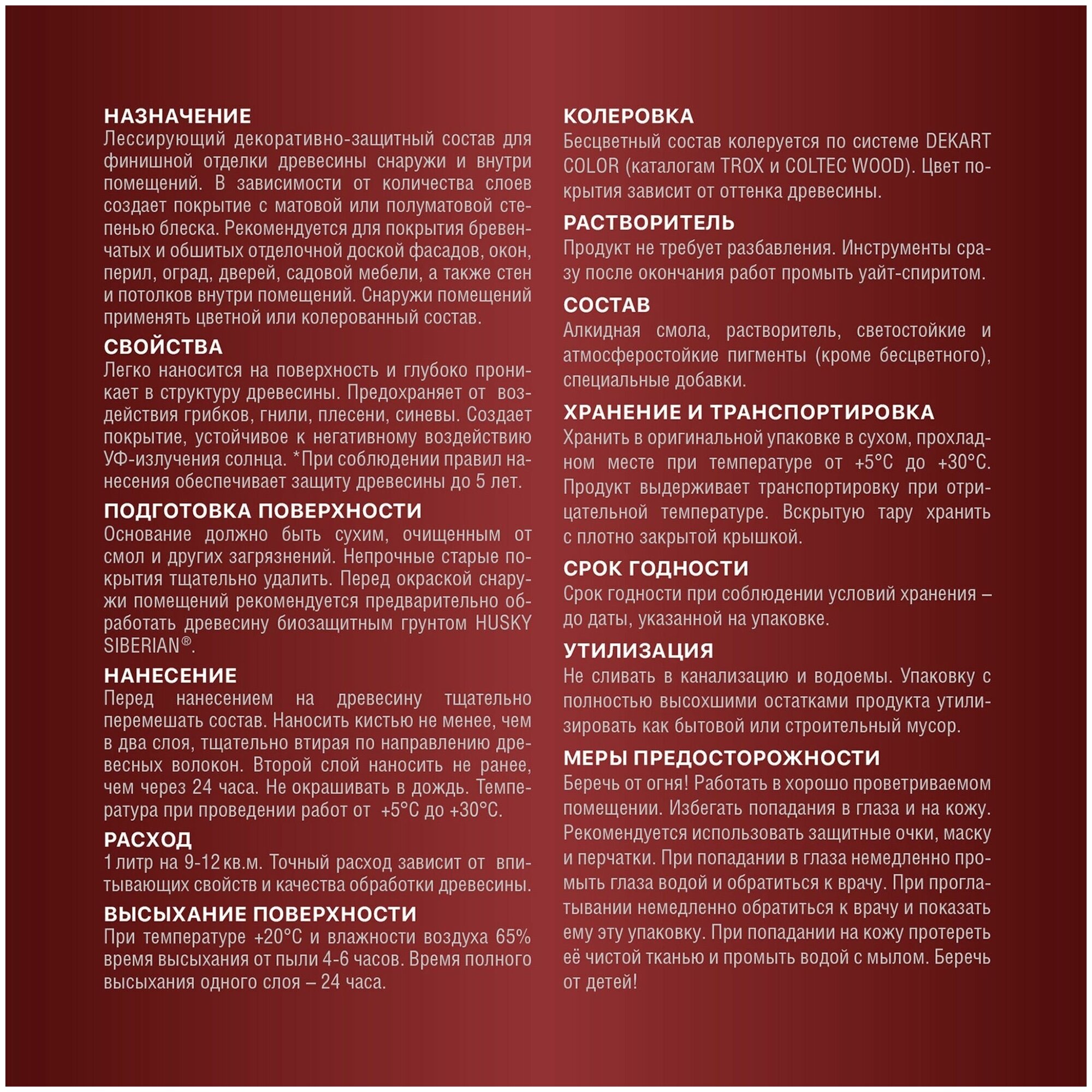 Глубокопроникающий антисептик НUSKY SIBERIAN - полупрозрачный состав для защиты и декоративной отделки древесины снаружи и внутри помещений, стойкий к УФ-излучению, содержит биозащитный комплекс, глубокопроникающий, эффективно защищает древесину до 5 лет.