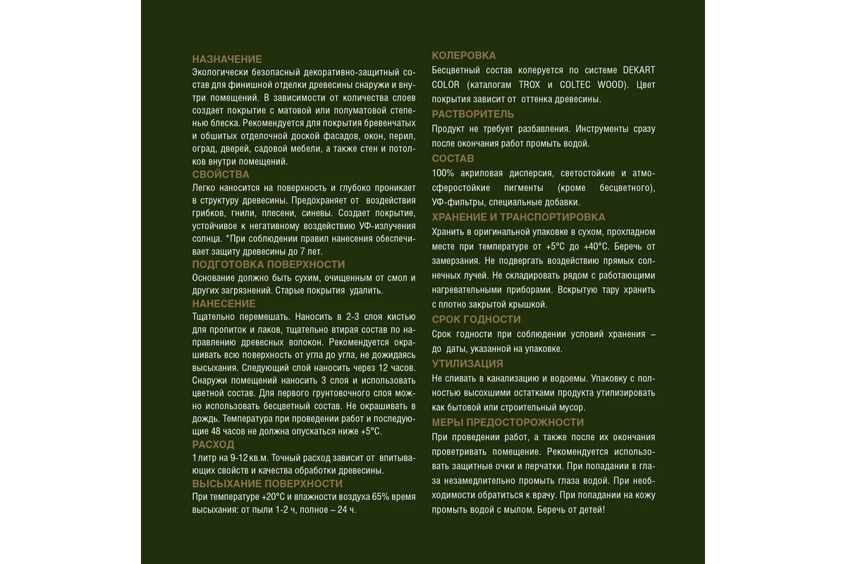 | Применение продукта | Защита и декорирование древесины |