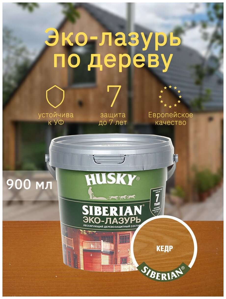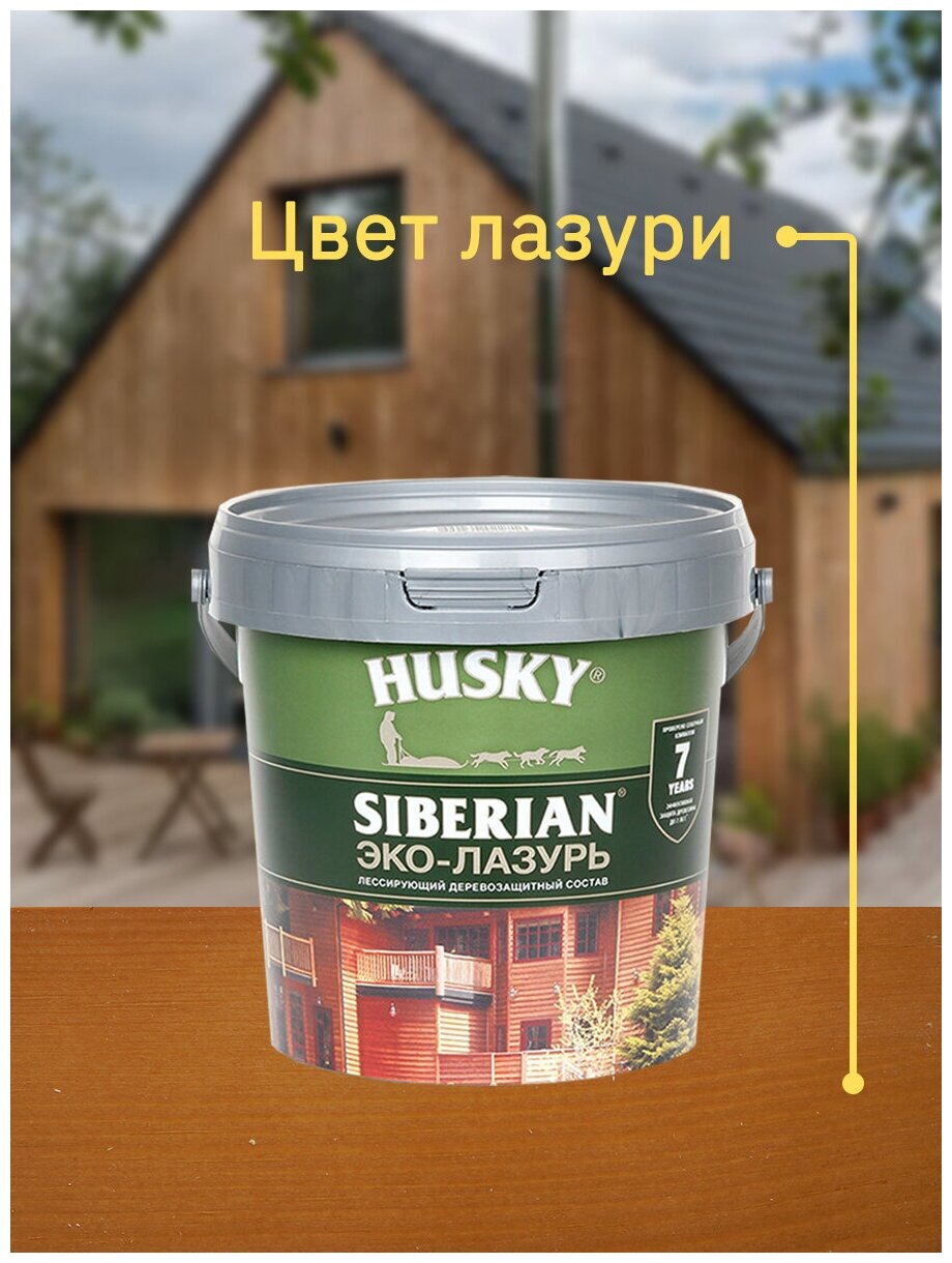 Эко-лазурь НUSKY SIBERIAN - полупрозрачный состав для защиты и декоративной отделки древесины снаружи и внутри помещений, содержит УФ-фильтр и биозащитный комплекс, быстросохнущий, глубокопроникающий, практически не пахнет, эффективно защищает древесину до 7 лет.