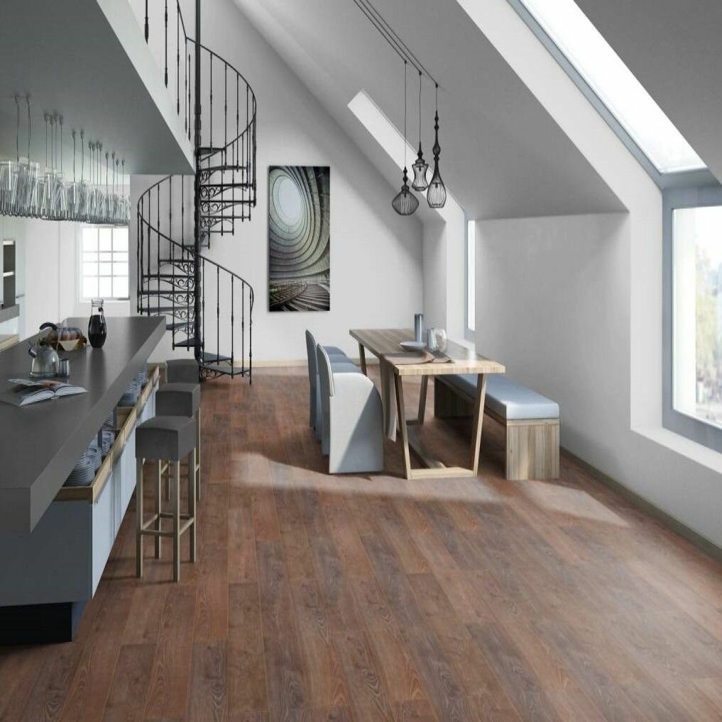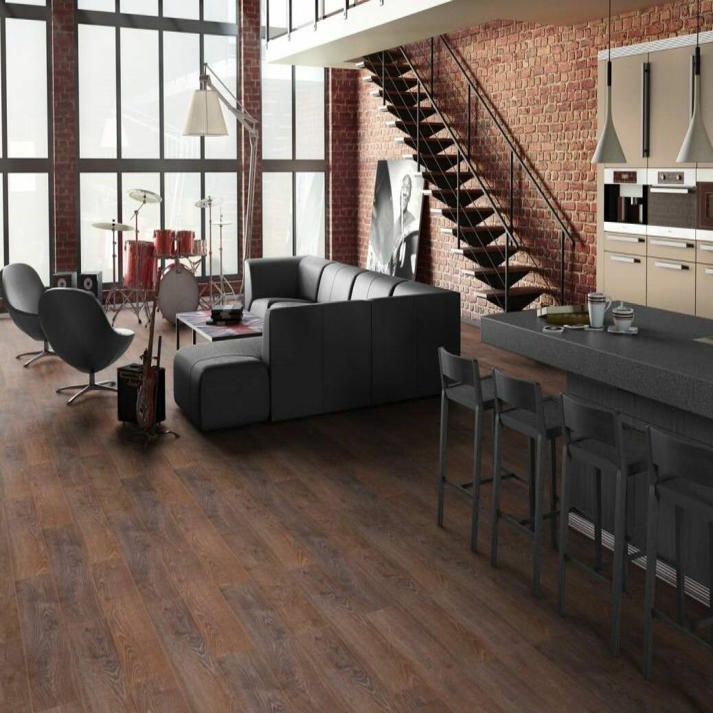 Половицы с фактурой состаренной древесины и четырехсторонней фаской создают впечатление благородного дубового паркета. Ламинат в сдержанной гамме оттенков подходит для воплощения в интерьере как элегантных классических, так и смелых современных стилистических решений.