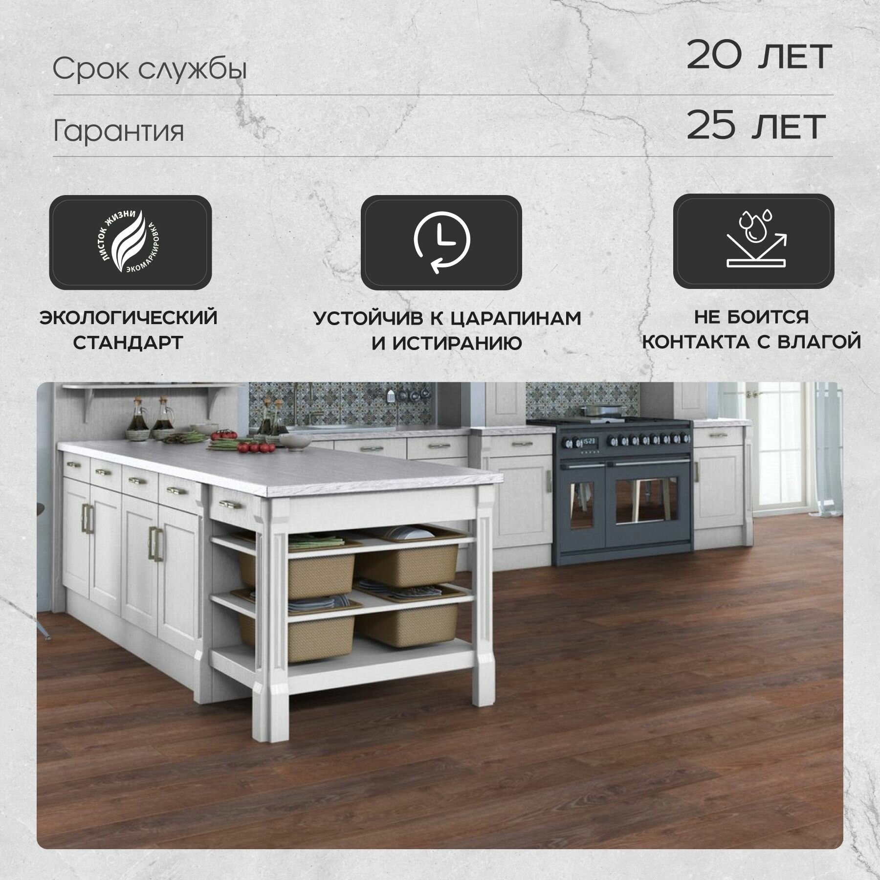 - Сверхпрочная поверхность ламината, обработанная меламиновой смолой, устойчива к износу, истиранию, воздействию каблуков, ножек мебели и колесиков кресел.