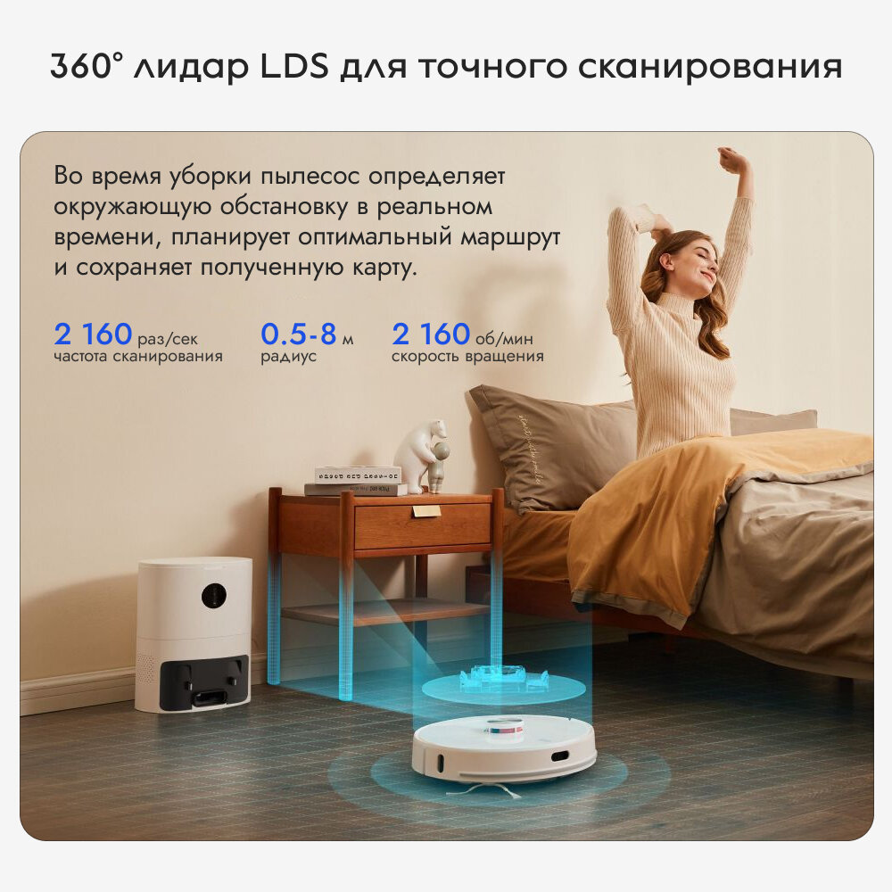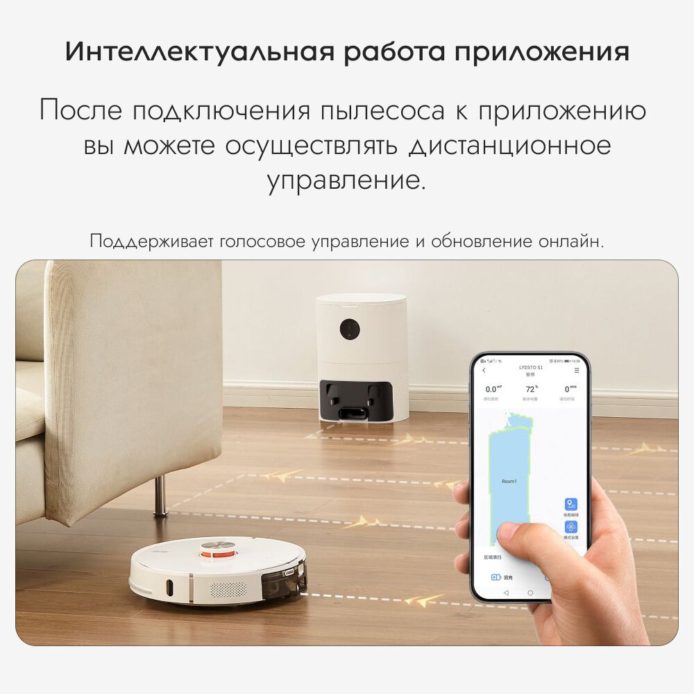 Робот-пылесос Xiaomi Lydsto – интеллектуальный уборщик для поддержания чистоты в доме с базой самоочистки. В зарядной док-станции установлен герметичный мешок для пыли большой емкости, с его помощью не нужно выбрасывать мусор после каждой уборки. В роботе-пылесосе установлена камера визуального позиционирования. Она дополняет лазерную систему навигации, которая находится в корпусе устройства. LDS-датчик сканирует окружение на 360° и определяет местоположение пылесоса в комнате. Контейнер для мусора у роботизированного пылесоса имеет объём 0.42 л. Доступ к отсеку-пылесборнику с HEPA-фильтром открывается через верхнюю крышку. При полном заряде емкой батареи в 5200 мА·ч пылесос может автономно работать до 2.5 часов. Удалённое управление пылесосом производится через мобильное приложение Mi Home (эко-система Xiaomi). Там же отображаются данные о заряде батареи, а также времени и площади уборки.