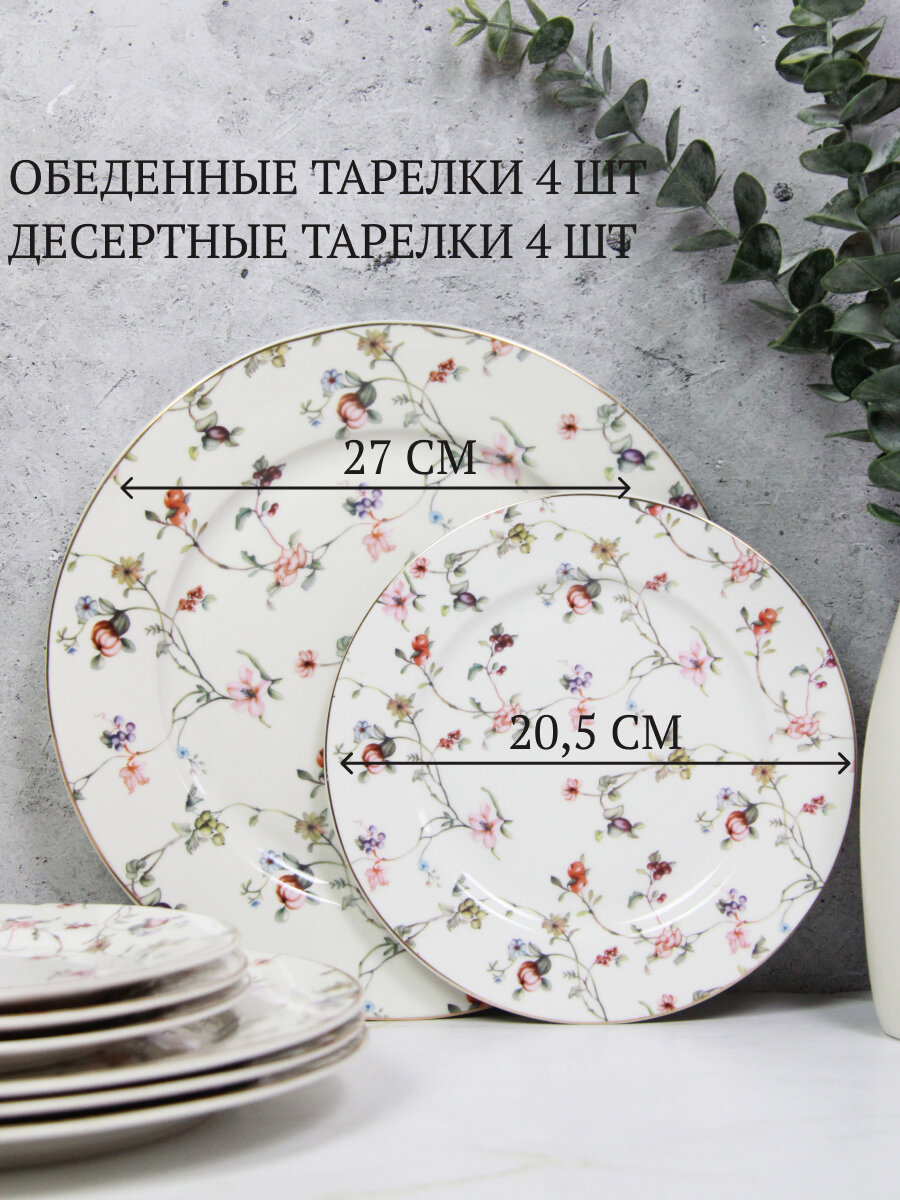 Столовый сервиз "ЗИРАНА" на 4 персоны из 14 предметов: 4 десертные тарелки 20,5 см, 4 глубокие тарелки 21,5 мм и 255 мл, 4 обеденные тарелки 27 см, салатник 1315 мл и 23 см, блюдо овальное 30,5 см. Столовый сервиз выполнен из высококачественного фарфора нового поколения, благодаря современным технологиям фарфор New Bone China не уступает традиционному костяному фарфору в прозрачности, белизне и прочности, но при этом гораздо экологичнее в производстве. Для посуды из столового сервиза рекомендуется ручная мойка. Нельзя разогревать в СВЧ-печи. Набор посуды из 14 предметов отлично подойдет для ежедневного использования, семейного обеда и ужина. Столовый сервиз поставляется в подарочной упаковке.