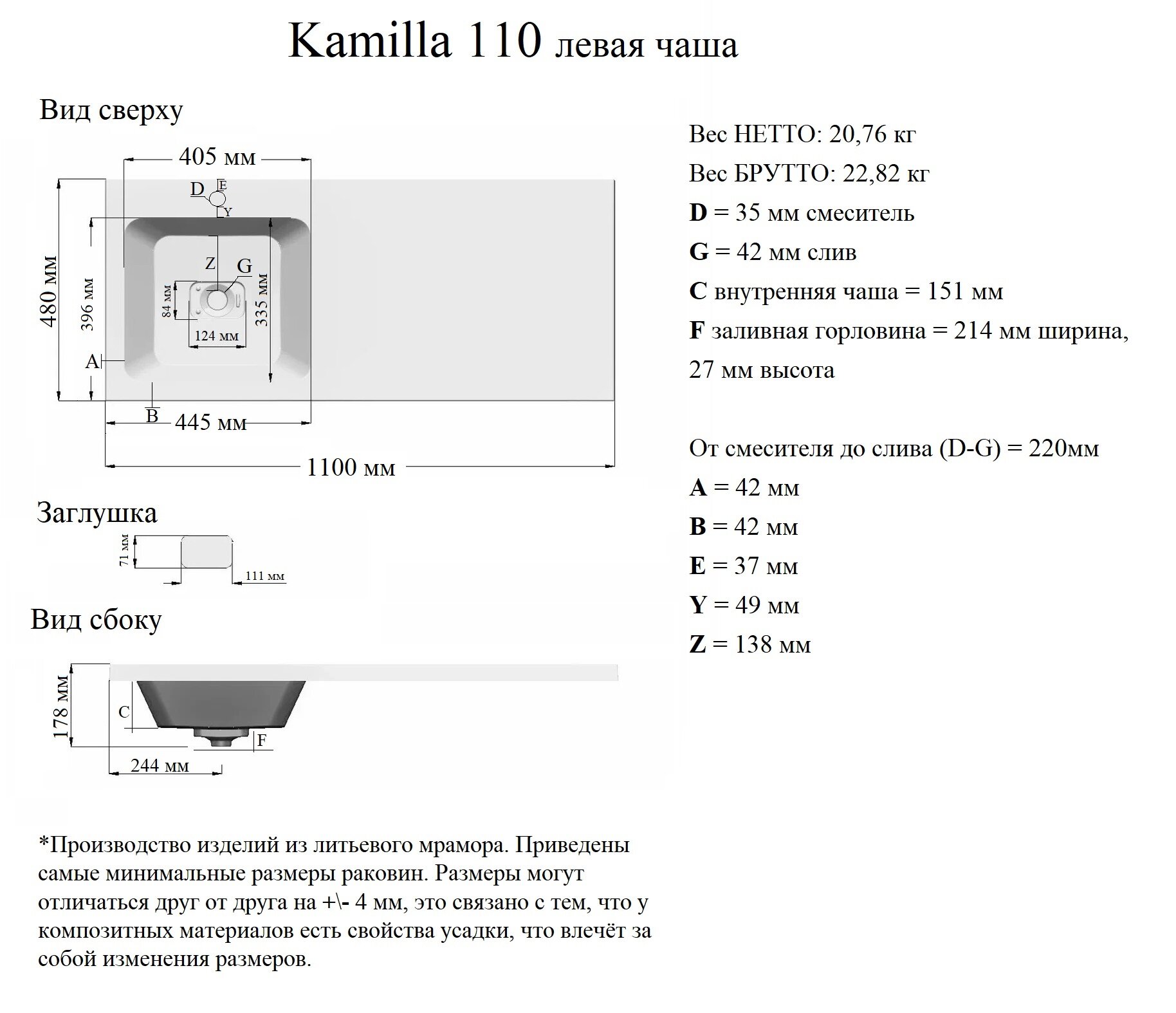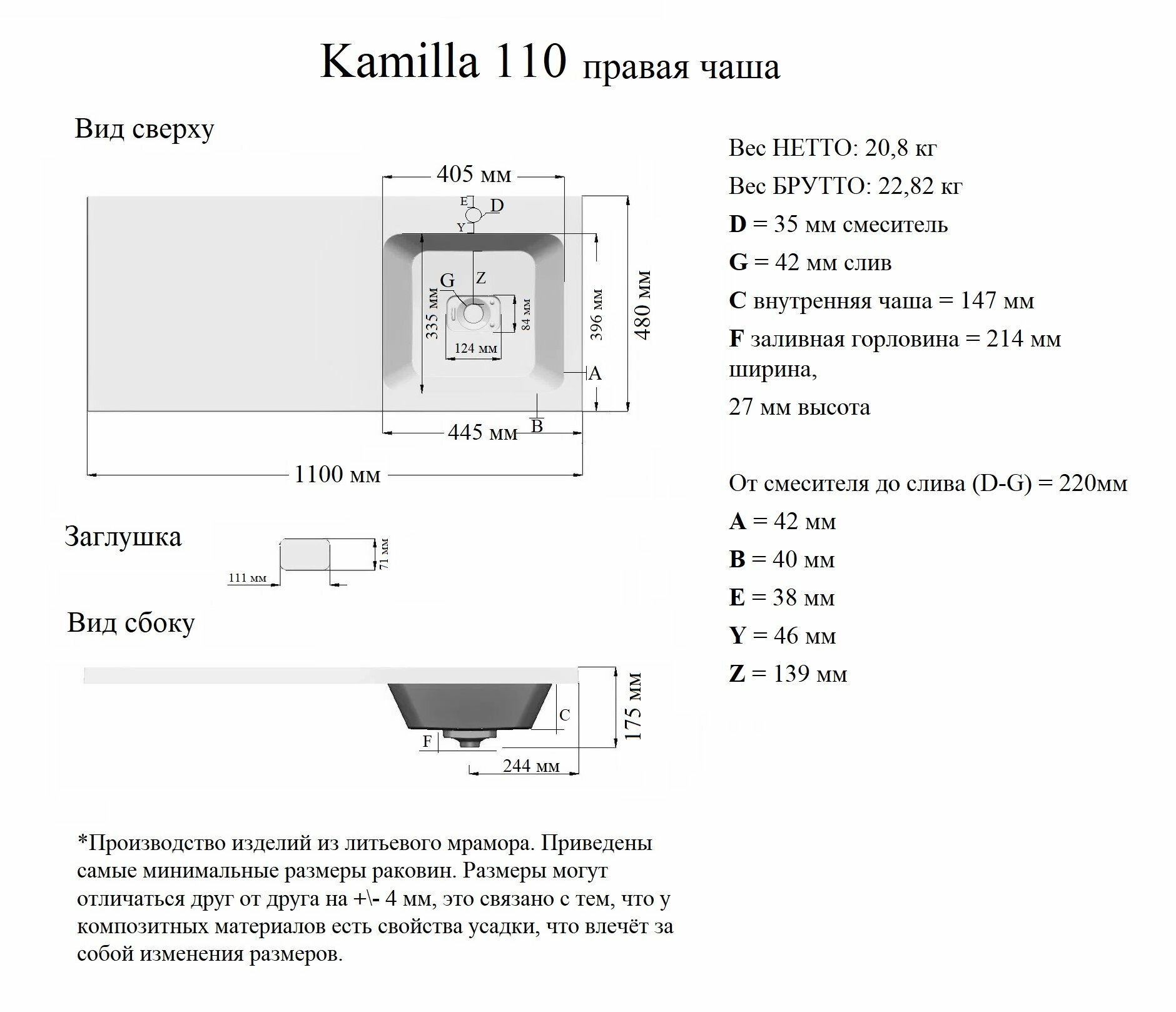 | Материал | Из искусственного камня (литьевого мрамора) |