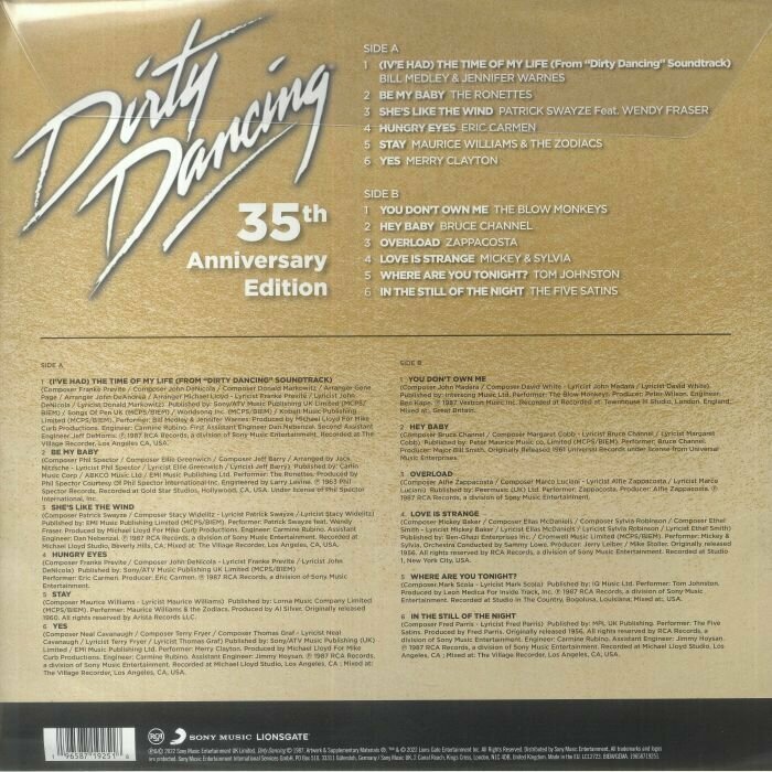 Фильм, запечатлевшийся в памяти каждого, и в значительной степени это связано с музыкой. В "Грязных танцах" есть много культовых моментов относящих саундтреки к романтической классике. Это специальное издание саундтрека, посвященное 35-летию, представлено на специальном диске. Трек-лист: A1 The Time Of My Life A2 Be My Baby A3 She‘s Like The Wind A4 Hungry Eyes A5 Stay A6 Yes B1 You Don‘t Own Me B2 Hey Baby B3 Overload B4 Love Is Strange B5 Where Are You Tonight? B6 In The Still Of The Night