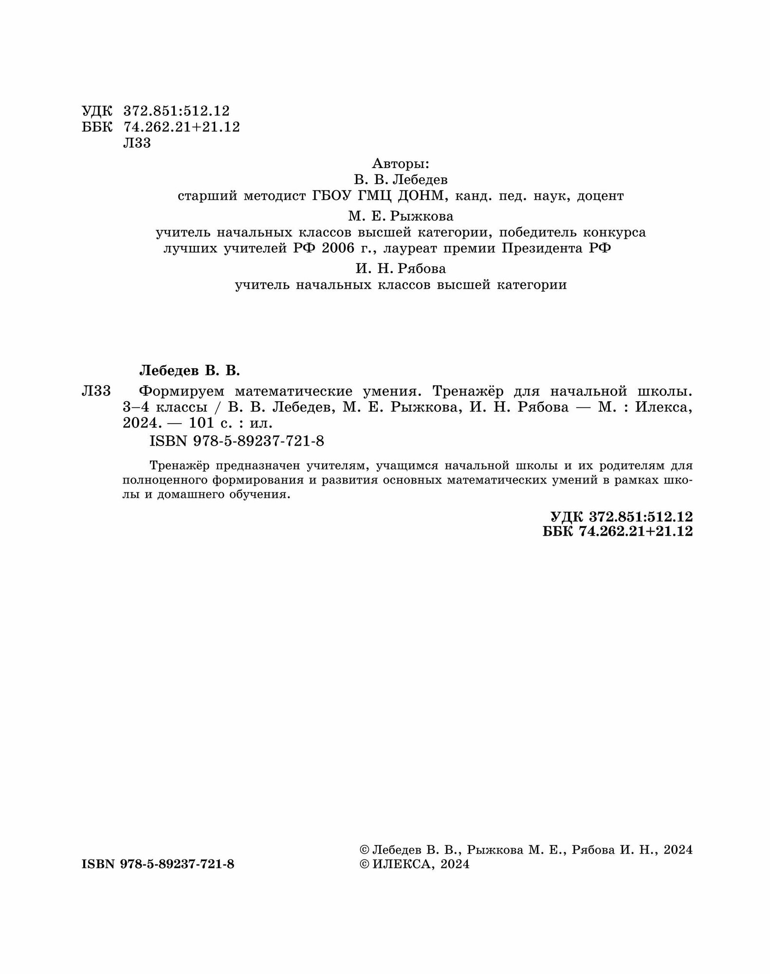 Формируем математические умения. 3-4 класс. Тренажер для начальной школы (Лебедев Валерий Владимирович, Рябова И. Н., Рыжкова М. Е.); Илекса, 2024