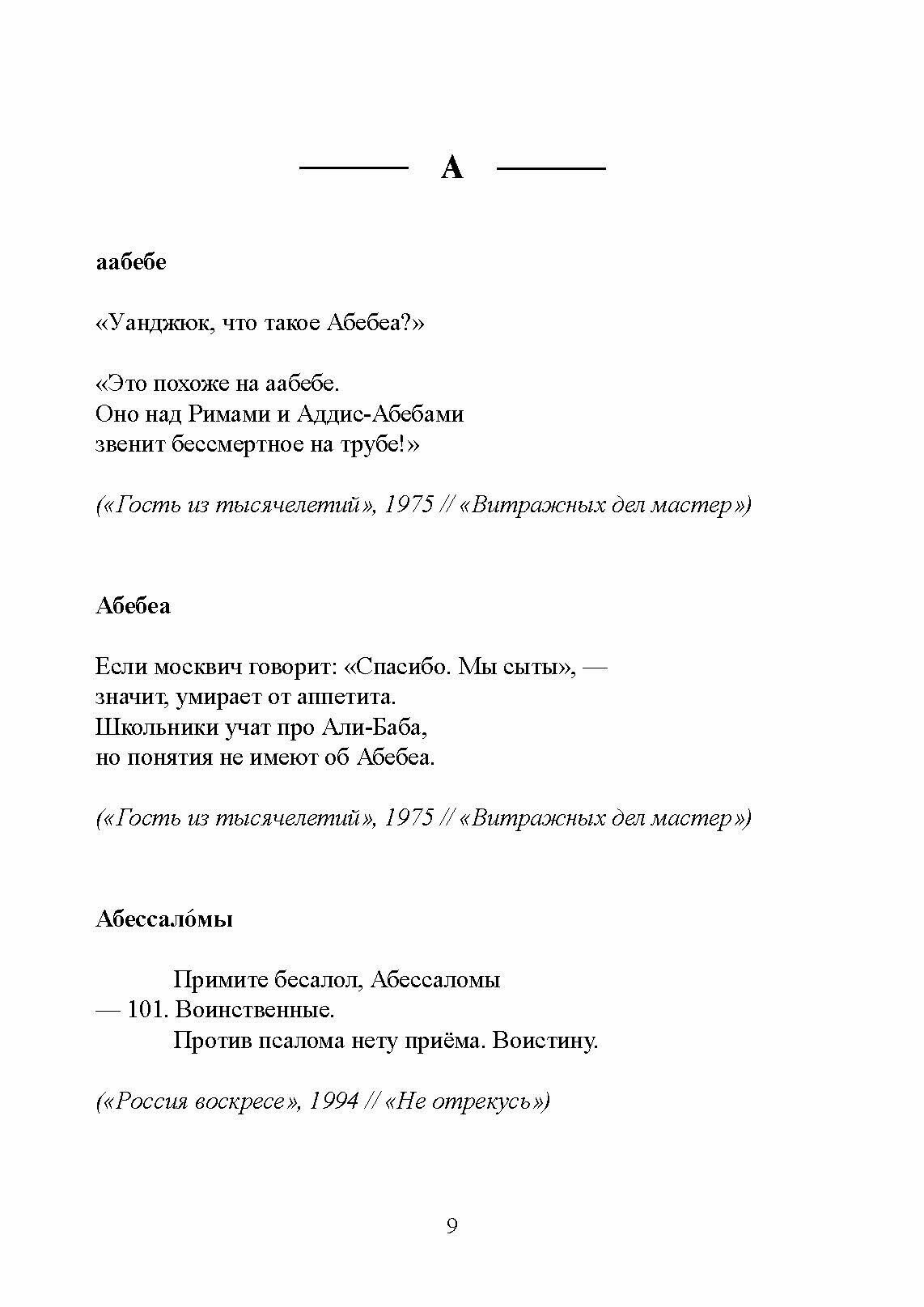 В словаре приведено более 2000 окказионализмов, обнаруженных в произведениях Андрея Андреевича Вознесенского (1933—2010). Издание посвящается памяти выдающегося русского поэта, создателя поэм «Мастера», «Лонжюмо», «Оза», «Авось!», множества глубоких и самобытных стихотворений.